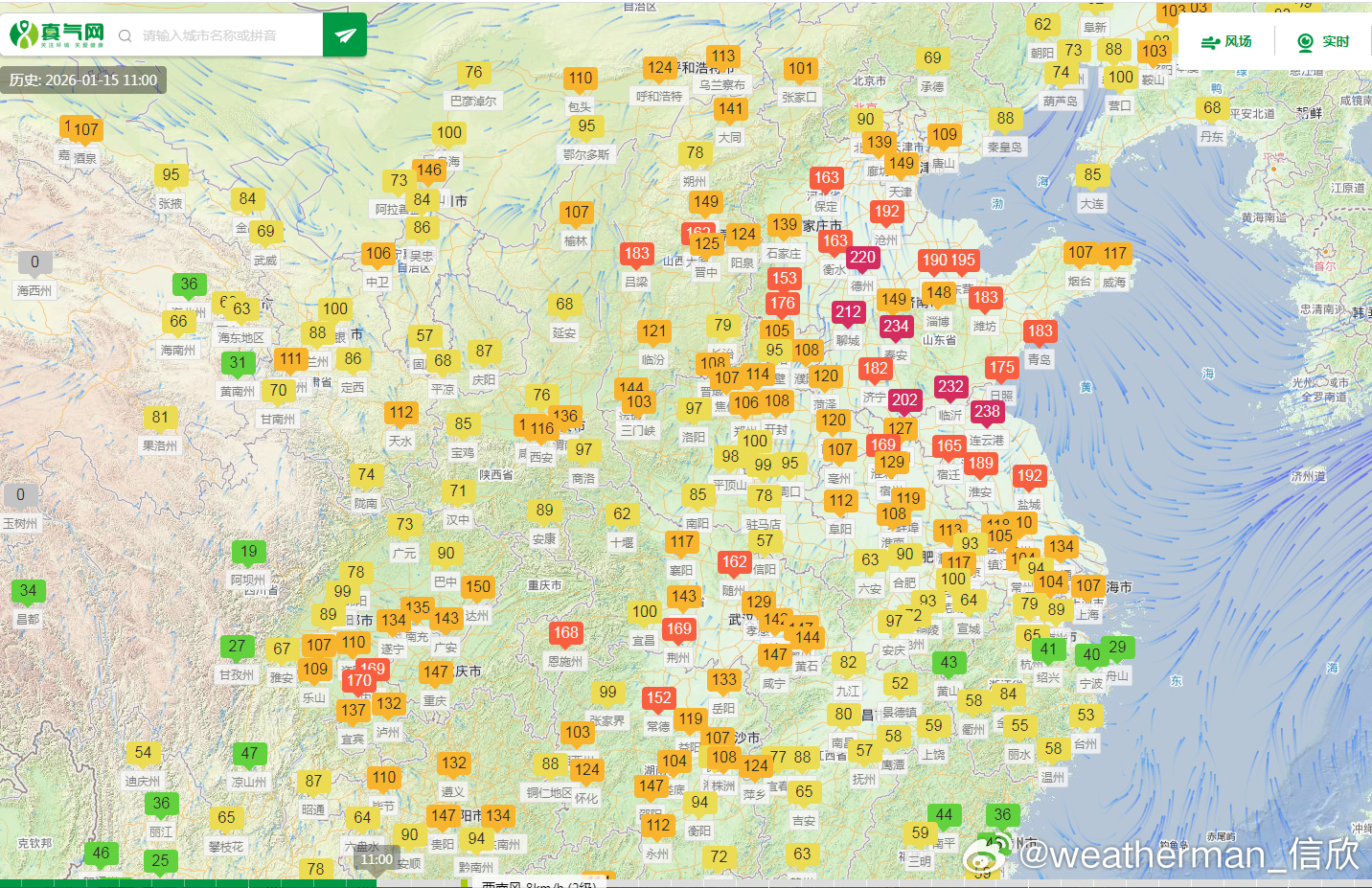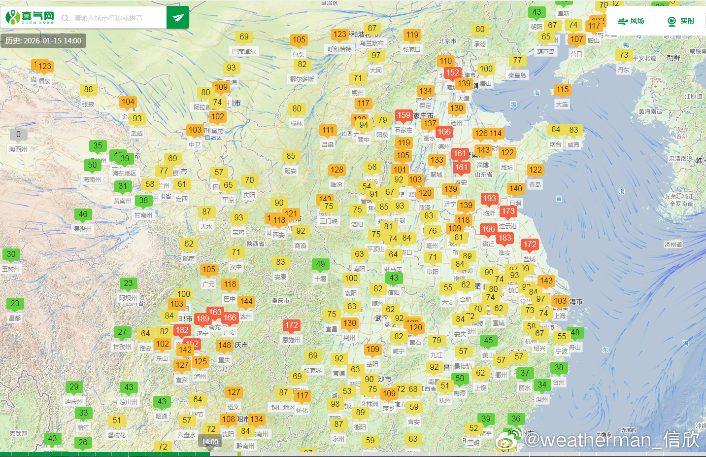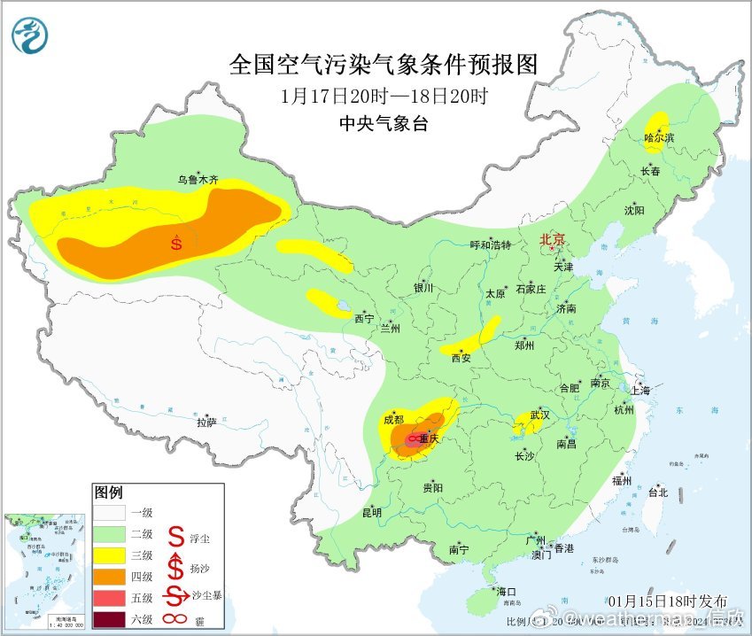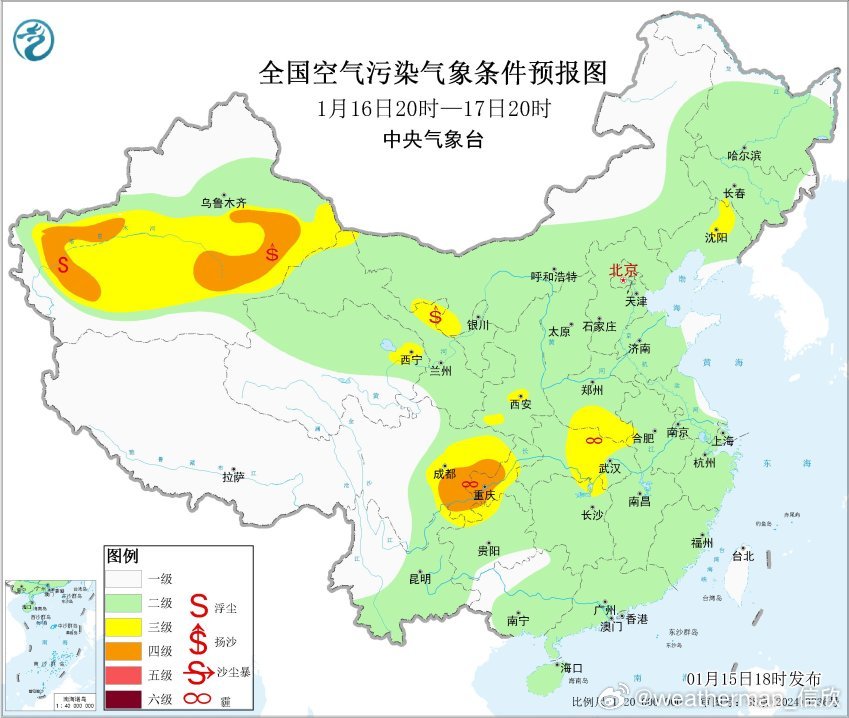 【雾和霾】预计15日夜间至16日早晨,四川盆地东部、重庆中南部、贵州东部、湖南西部、山东南部、江苏、上海等地有大雾天气,局地有能见度不足200米的强浓雾。而且这个雾不干净,可能是雾和霾混杂。从今天空气质量演变看,四川盆地、山东、江苏存在中度-重度污染,对应有霾。未来2天,随着冷空气不断南下,华北中南部、黄淮等地的霾天气自北向南逐渐减弱或消散。但四川盆地的霾可能还会维持。此外17日至18日,受冷空气大风影响,新疆南部、青海北部和东部等地将有沙尘天气。
