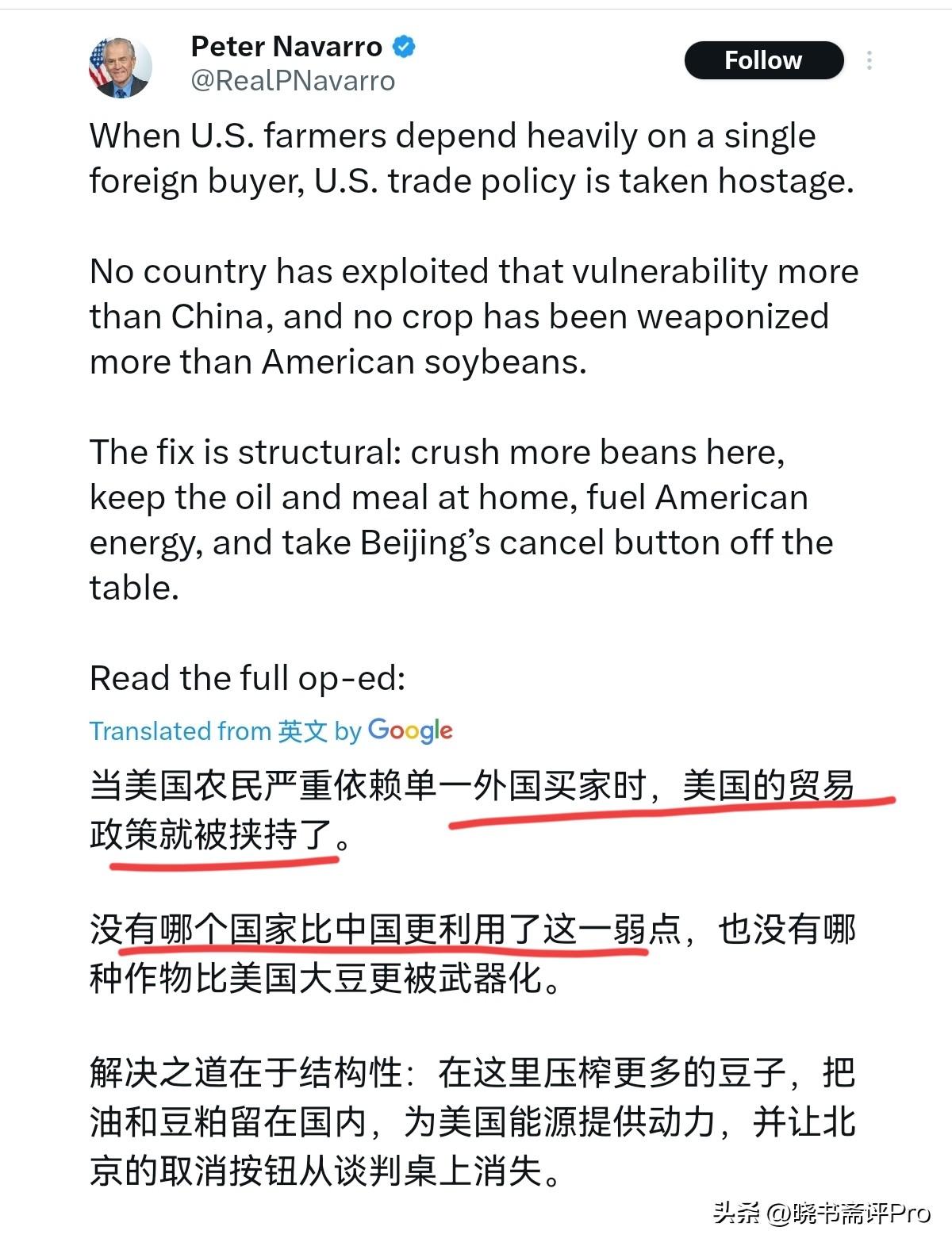 在尝到我们反制的苦头之后,美国白宫贸易顾问纳瓦罗出来想招对付我们了!1月15日,纳瓦罗声称,当美国农民严重依赖单一外国买家时,美国的贸易政策就会陷入被动。没有哪个国家比中国更擅长利用这一软肋,也没有哪种农作物比美国大豆更被频繁当作博弈工具,解决之道在于结构性调整。 扩大本土大豆压榨产能,留存豆油与豆粕供应国内市场,为美国能源产业提供燃料,让北京方面彻底失去“断供施压”的筹码。很显然,在我们反制美国,让美国吃到苦头之后,美国鹰派政客这是想招要对付我们了。不过,此人要对付我们,但是好像连基本的事实都没有搞清楚。 此人声称,没有哪个国家比中国更擅长利用这一软肋,那我们倒是想问,是我们主动反制美国了吗?事实难道不是美国先对我们发动贸易战,我们才反制的吗? 在被我们打疼之后,纳瓦罗建议通过扩大本土大豆压榨产能,为美国能源产业提供燃料等手段,摆脱对于中国单一市场的依赖。 纳瓦罗的招看起来不错,但是事实上却一点可行性都没有。其一,压榨的豆油,美国要如何解决?其二,压榨后的豆粕,美国怎么处理?事实上,美国本土压榨成本过高,美国指望国内养殖企业去消耗这些豆粕吗?其三,将豆油用于生物燃料性价比低于汽油,这如何解决呢?很显然,根本性的问题就在于美国不能将贸易武器化,如果美国政客还是对抗思维作祟,那美国本质上就是自己给自己找麻烦。
