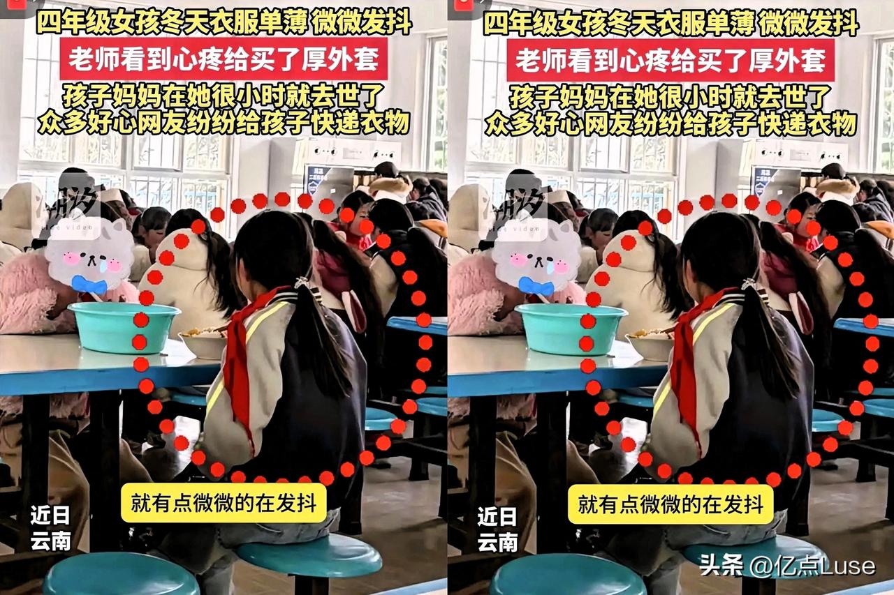 泪目!云南,一名四年级女孩冬天身着单薄衣衫上学,在学校食堂吃饭时冻得微微发抖。英语老师瞧见,鼻头一酸,私下为女孩买了件过冬外套。老师将此事发上网后,引发网友关注,后续之事如爱心传递,十分暖心。 从英语老师拍的女孩背影照可见,一月云南气温很低,同学们都裹着厚外套,女孩却只穿了件薄秋衣,且材质不防风,看着她瘦弱的背影,着实心疼。 询问后,英语老师得知女孩母亲在她幼时离世。交谈中,女孩身子仍在发抖,老师深受触动,自掏腰包为她买了厚外套。 英语老师将此事发上网记录日常,没想到引发网友关注,收到诸多私信,有网友想给女孩寄衣服、帽子、围巾等。为让爱心延续,老师留下了收货地址。 不久,英语老师陆续收到许多包裹,除过冬衣物,还有鞋子、牙膏、牙刷等日用品。 除实物捐赠,还有网友愿资助女孩求学费用。英语老师透露,班里还有几名同学家庭困难,与捐赠网友协商后,将多余衣物分给了他们。 如今女孩能暖暖和和上学了,希望她心怀感恩,努力学习,日后有成就时将爱心继续传递。 一件过冬外套的善意,本是教师对学生的关怀,却在网络上演变成一场爱心接力。这并非惊天动地的壮举,只是普通人的“举手之劳”,却印证了“善意会传染”——微小温暖被看见,便能汇聚成照亮困境的光。 对此,你怎么看?欢迎聊聊。