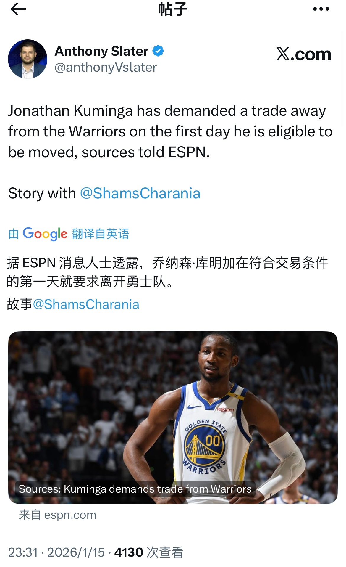 BrettSiegel:勇士队对小迈克尔·波特的交易报价为库明加,穆迪,希尔德和