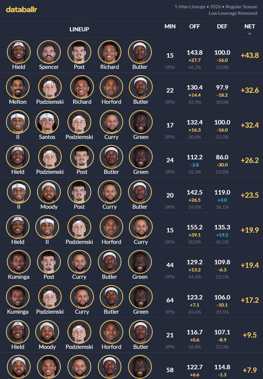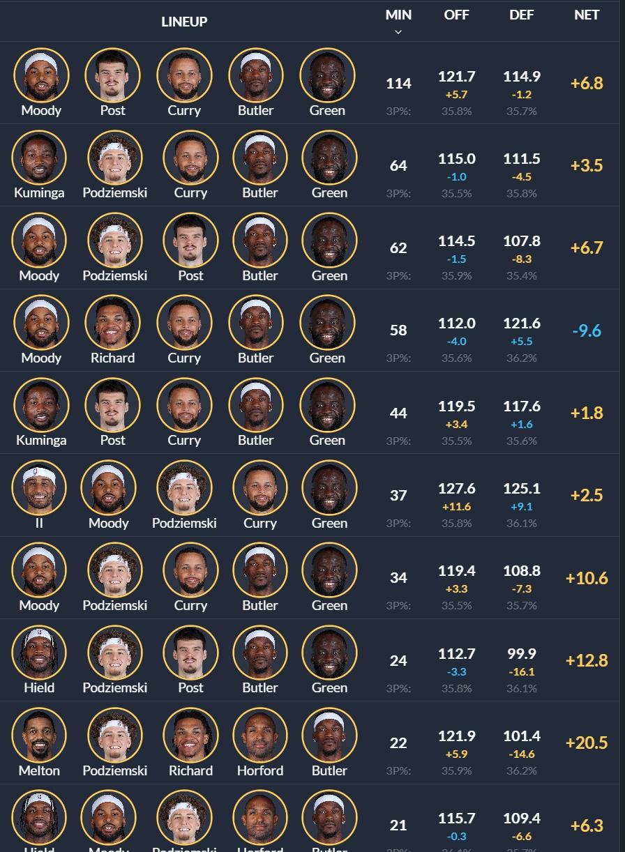 图1,前半程最赢分(实际打出的效果,包含投篮随机性)的阵容前十。 图2,前半程用得最多(攻防三分都调整为联盟平均,即忽略投篮随机性)的阵容前十。 金州勇士[超话] 赛季中想法