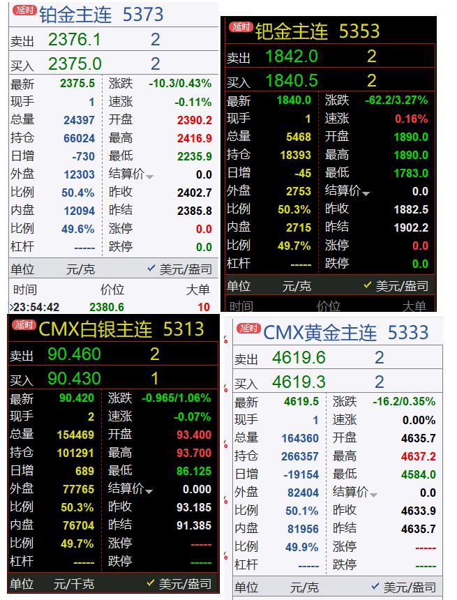 准备休息了, 看眼国际贵金属情况。 国际贵金属的四大品种 齐刷刷回落,都呈现跌势。 纽约交易所的黄金 跌势最弱,为0.35%; 铂金主连下跌0.43%; 白银期货下跌1.06%; 钯金主连下跌3.27%。 关注贵金属下方支撑情况!