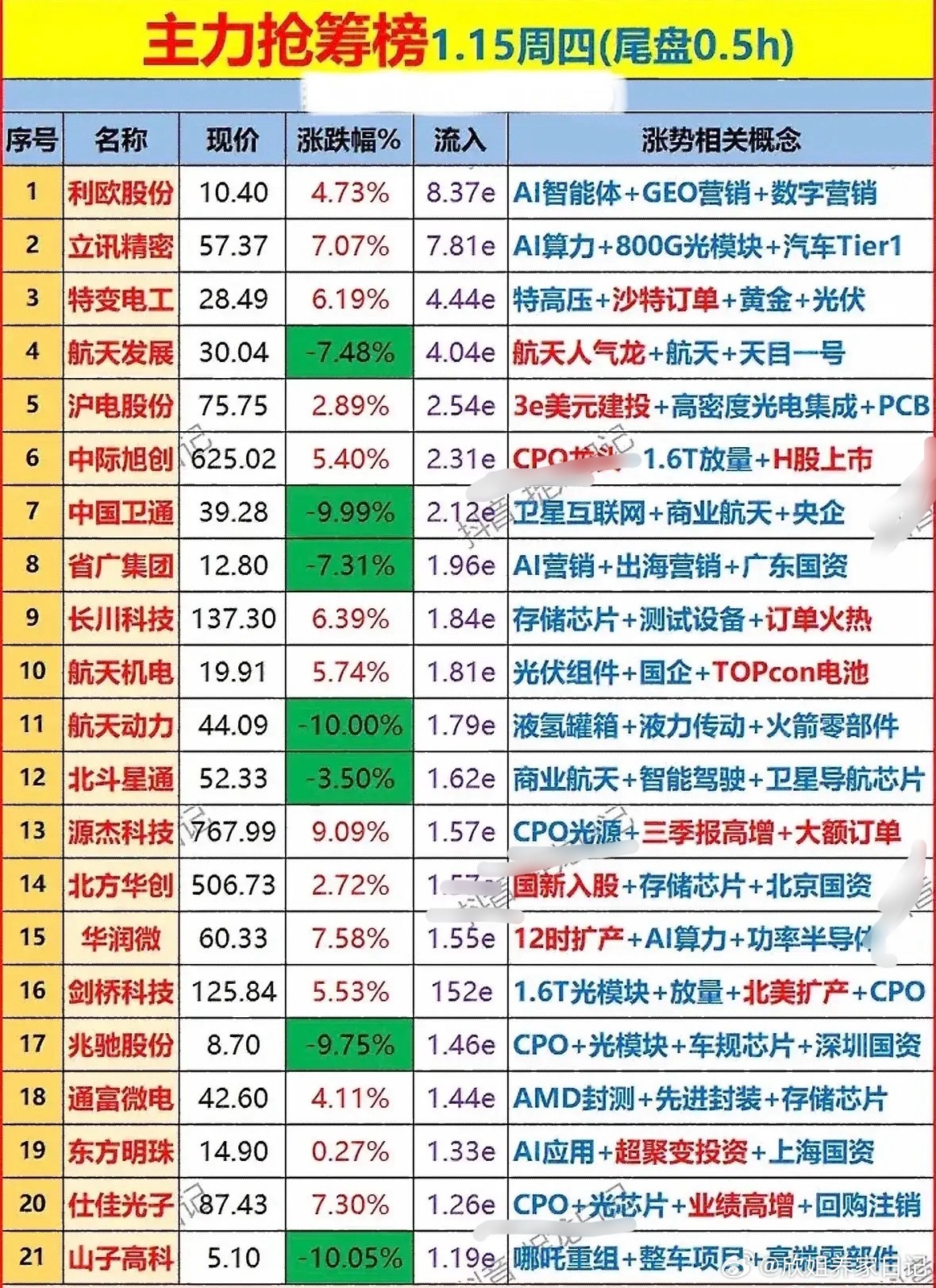 1月15日尾盘主力抢筹榜:科技赛道成核心,抄底与追高双线并行1月15日尾盘半小时,主力资金聚焦科技主线,呈现“题材集中、涨跌分化”特征,AI、CPO、航天、半导体四大赛道成为资金布局核心,既有对强势标的的追高抢筹,也有对超跌个股的抄底博弈。一、资金流入TOP5核心标的(兼具题材与资金强度)1. 利欧股份(10.40元,+4.73%):主力流入8.37亿居首,AI智能+GEO营销概念叠加,科技营销题材获资金高度认可,涨幅与资金流入形成正向共振;2. 立讯精密(57.37元,+7.07%):流入7.81亿,AI算力+800G光模块多题材加持,资金积极进场推动股价走强;3. 特变电工(28.49元,+6.19%):流入4.44亿,特高压+光伏双主线,传统基建与新能源结合获稳健布局;4. 航天发展(30.04元,-7.48%):逆势流入4.04亿,航天人气龙+天目一号概念,尾盘资金抄底意图明显;5. 沪电股份(75.75元,+2.89%):流入2.54亿,3e美元建投+PCB题材,科技制造领域获小幅布局。二、资金布局两大核心特征1. 强势赛道集中追捧:CPO(中际旭创、源杰科技、剑桥科技、仕佳光子)、半导体(长川科技、北方华创、华润微、通富微电)、AI相关(利欧股份、立讯精密、省广集团)成为资金密集区,核心标的多伴随题材+业绩(如源杰科技三季报高增)或技术优势(如先进封装、1.6T光模块);2. 超跌标的抄底博弈:多只科技题材股逆势获资金流入,包括跌停的中国卫通(卫星互联网)、航天动力(液氢罐箱+火箭零部件),大跌的省广集团(AI营销)、兆驰股份(CPO+车规芯片)、山子高科(车企重组),体现资金对超跌科技股的短期博弈需求。三、总结与展望尾盘资金明确指向科技赛道,布局逻辑分为两类:一是聚焦业绩支撑、题材强势的核心标的(如CPO龙头、半导体设备股);二是博弈超跌科技题材的修复机会(如航天、AI营销)。后续需重点关注科技主线的持续性,以及超跌标的能否借助资金流入实现短期修复,操作上需区分强势标的趋势机会与超跌标的博弈风险。