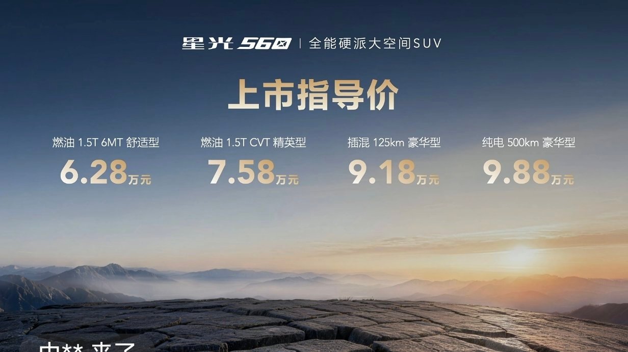 (上市指导价)星光 560 燃油1.5T 6MT舒适型:6.28万元 燃油1.5T CVT精英型:7.58万元 插混125km豪华型:9.18万元 纯电500km豪华型:9.88万元星光560 哇塞!不超过十万,就能有这么多配置!有点心动~