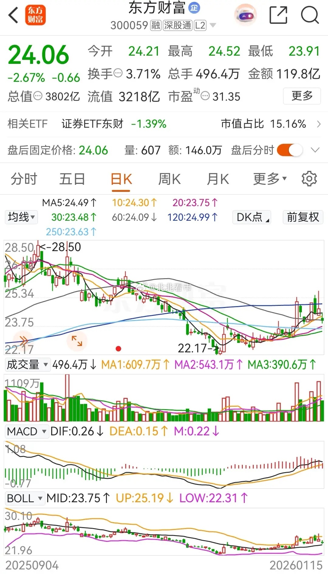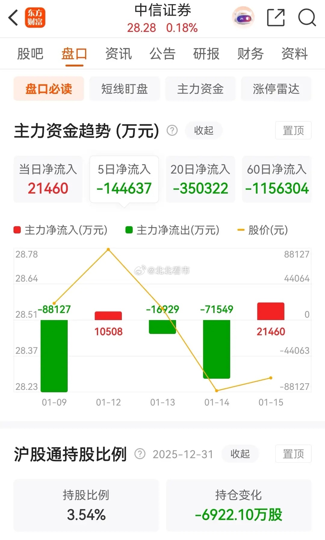 券茅东方财富今天下跌,而券商一哥中信证券今天则是上涨;二者昨天的走势也恰好与今天完全相反。东方财富今天早盘低开后在低位窄幅整理,收盘时的跌幅为2.67%,收盘报价为24.06元。在资金流向上,今天被主力资金大幅净卖出了 17.0708亿元,而近五个交易日则是被主力资金合计净卖出了约3.6768亿元。从走势上看,虽然近期有调整,但是年内的涨幅依然还有3.8%。中信证券今天一直都是处于红盘,最低也只是打到了昨日得收盘价,今天之所以红盘,与昨日盘后公布的2025年业绩快报有关,显示业绩大超预期,详细情况是,2025年公司实现营业收入748.30亿元,同比增长29%;归母净利润300.5亿元,同比增长38%。今天收盘时上涨了0.18%,收盘报价为28.28元。在资金流向上,被主力资金净买入了2.1460亿元,近五个交易日则是被主力资金合计净卖出了 14.4637亿元。从当前的走势上看,目前的日线级别走势处于破位态势之中,仍然需要中大阳线来修复,截止今天收盘时,中信证券在年内的涨幅为-1.50%。至于更详细的技术分析,可以查看上一篇中关于券商概念板块的走势分析。对于东财和中信的后续走势,可以乐观期待,但是面临的风险也不能忽视,详细情况如下。东方财富存在着高增长下的隐忧,一是减持的压力:实控人亲属在2025年累计减持套现近百亿元,引发市场对内部信心的担忧;二是业务单一性:收入高度依赖于证券经纪和基金代销,易受费率调整、市场缩量及政策收紧冲击。中信证券则是存在着信用风险与政策干扰,一是信用减值激增:2025年Q3计提50亿元信用减值损失(主要为买入返售金融资产亏损),风控能力遭质疑;二是政策工具化:监管层通过尾盘压单(如31亿大额卖单)调控指数节奏,导致业绩与股价显著背离。