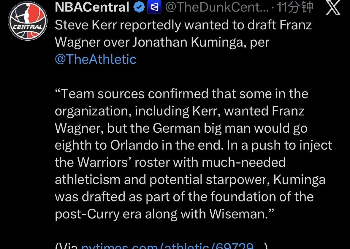 纽约时报the Athletic:科尔当年更希望选小瓦 另一篇分析库明加交易的超级长文 从勇士队在已经解散的G League Ignite项目中选中库明加,到现在为止,这种“库明加体验”对勇士队来说实在发生得太频繁了,远远超出他们所希望的程度。但显然也不完全是他的问题——2021年夏天他刚到队时,确实收到了一些勇士内部重要人物的混合评价。 球队消息人士证实,包括科尔在内的一些组织内部人士,当时更希望选中弗朗茨·瓦格纳,但这位德国大个子最终在第八顺位被奥兰多魔术选中。为了给阵容注入急需的运动能力和潜在明星气质,勇士队最终选下库明加,将他与怀斯曼一起视为“后库里时代”基础建设的重要组成部分。