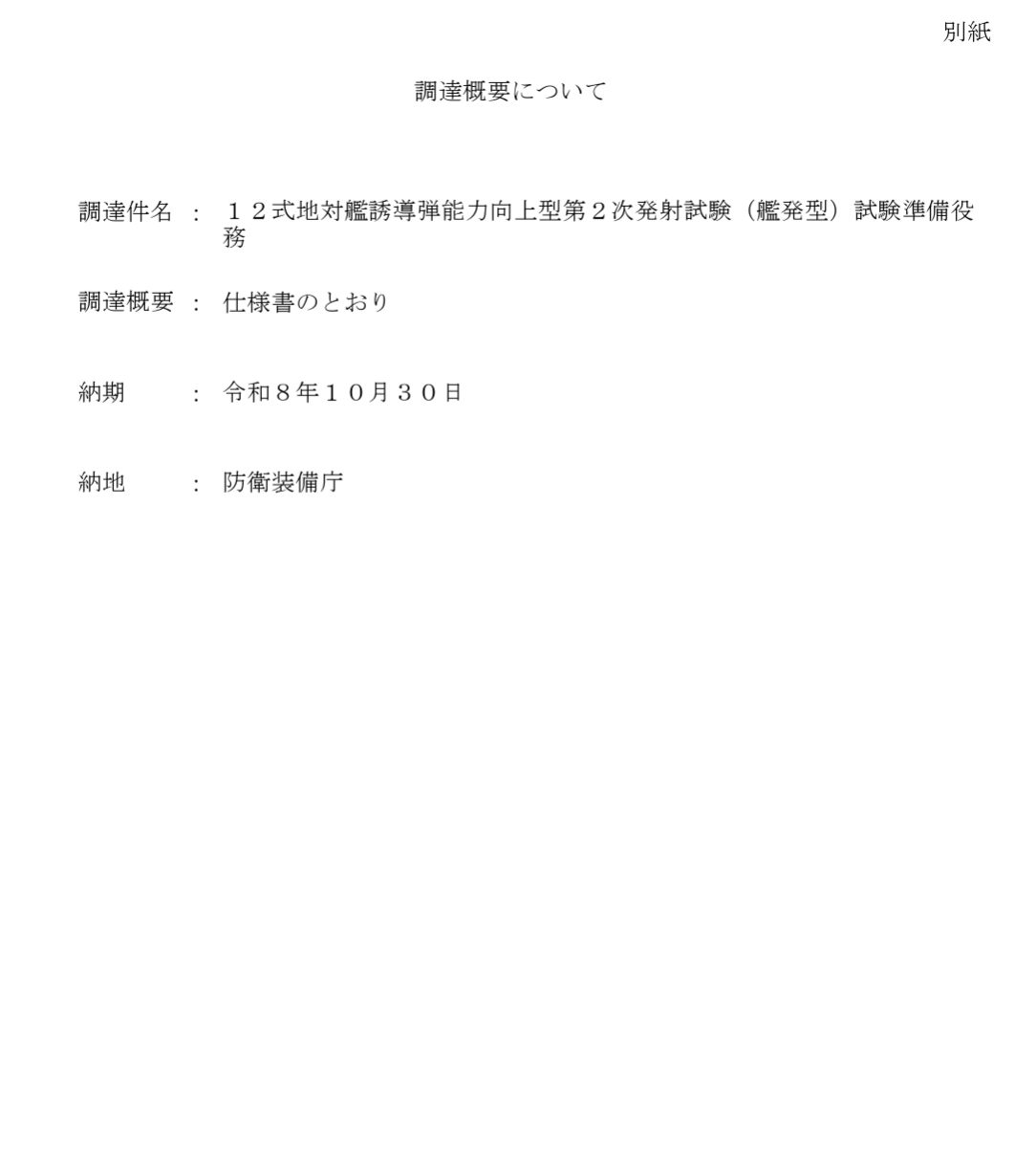 12SSM-ER舰发型第二次发射试验准备事务发标