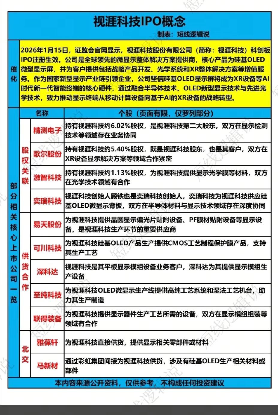 1月16日,周五A股这个板块有望大涨!!! 视涯科技股份有限公司科创板IPO生效,公司是全球领先的微显示整体解决方案提供商,核心产品为硅基OLED显示屏,重点关注:歌尔股份、深科达、至纯科技,让我们拭目以待吧!!!