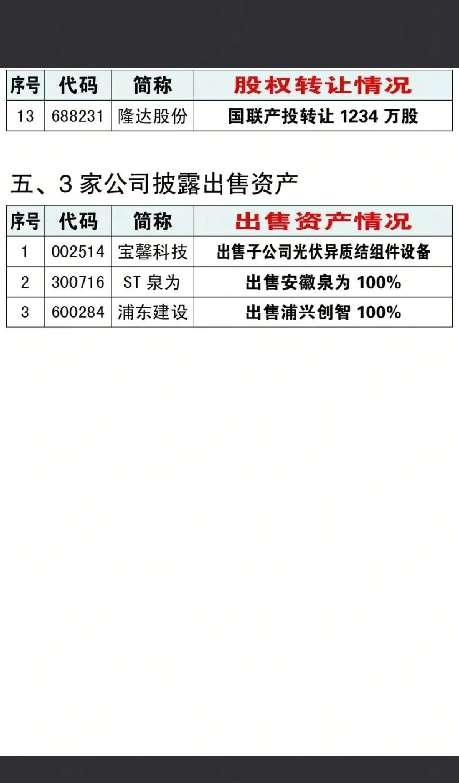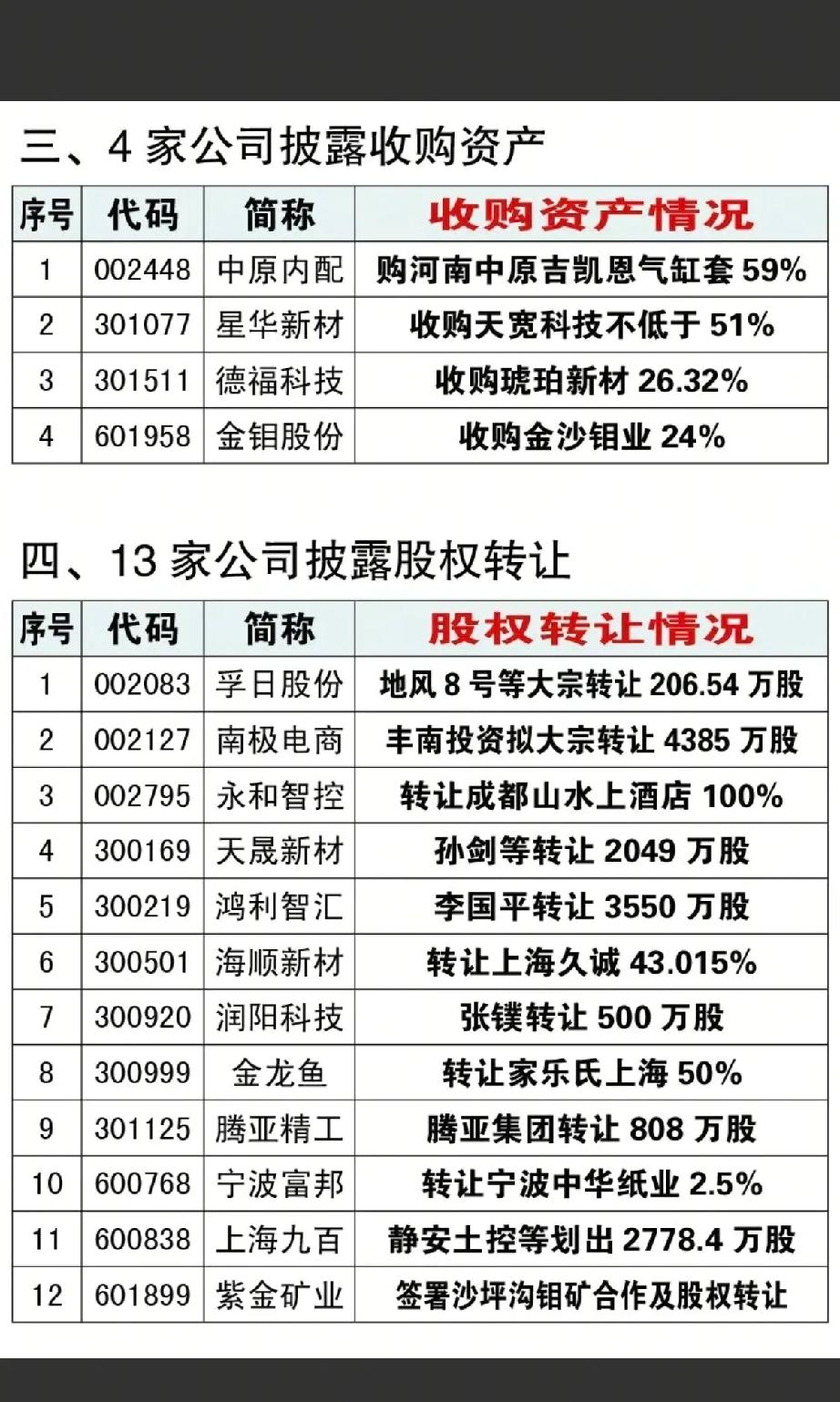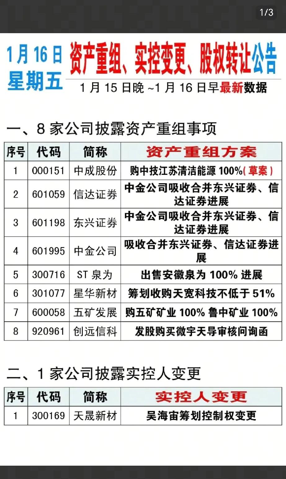 1月16日,周五A股这些股票有望大涨!!! 8家公司披露资产重组事项,重点关注:星华新材筹划收购天宽科技不低于51%,后市值得高看一眼;1家公司披露实控人变更;4家公司披露收购资产;13家公司披露股权转让;3家公司披露出售资产!!!