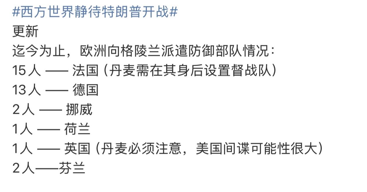 哈哈哈哈哈,我要笑喷了,这是目前欧洲各国向丹麦派兵的情况! 最多的是法国15个人!大手笔啊,这是啥?是派兵还是派的拉拉队观战的!? 还有那派一个的是什么意思?就差你那一个是吗? 你们太搞笑了,确实派兵了,但是派了跟没派一样! 你这无疑特朗普那老头打了强心剂,更自信了,更疯狂了,更肆无忌惮的想要格陵兰了!整个欧洲找不出来千儿八百个纯爷们吗?!无语凝噎![捂脸][捂脸][捂脸][捂脸]
