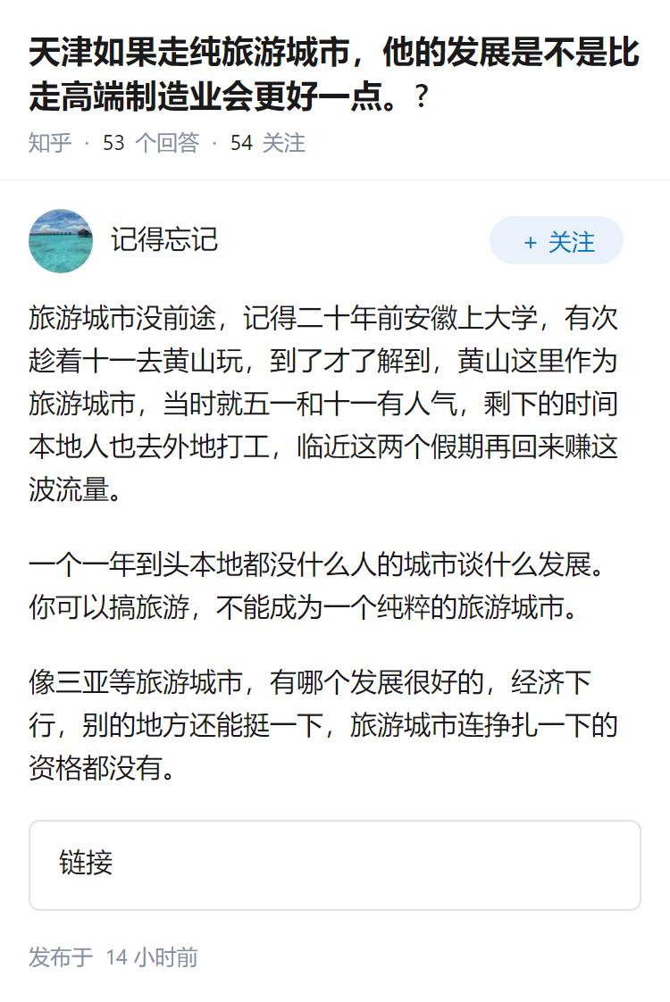 天津如果走纯旅游城市,他的发展是不是比走高端制造业会更好一点。? 现在感觉天津的