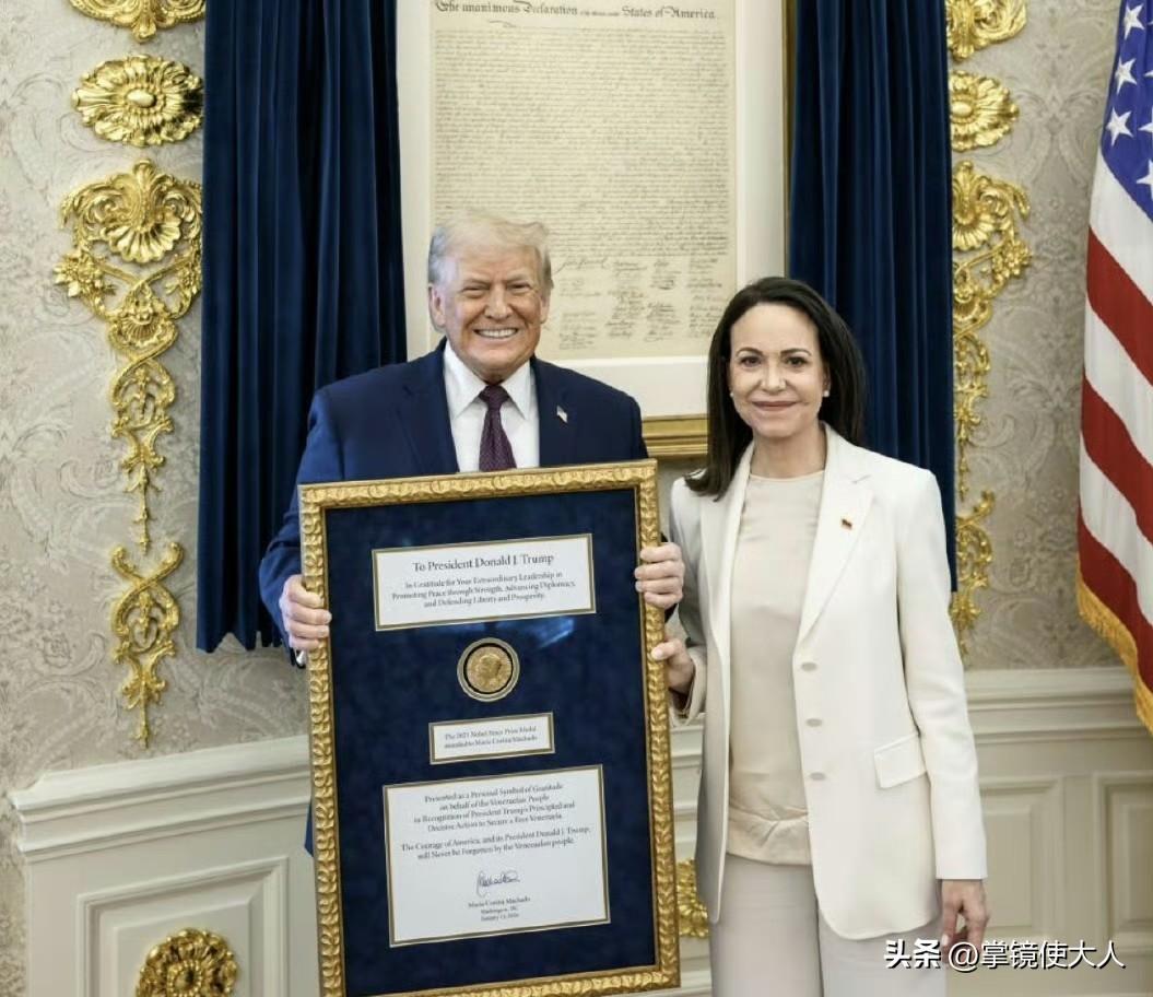 世界果真是一个大草台班子! 委内瑞拉的马查多,将自己的诺贝尔和平奖送给了特朗普,特朗普表态我没找她要,是她自愿给的! 委内瑞拉反对派的马查多,前往白宫与特朗普进行会面,她将自己在2025年10月获得的诺贝尔和平奖,转赠给了特朗普,并感谢他为委内瑞拉人民的付出。 有意思的是马查多曾在2024年被马杜罗下令逮捕过,2025年就拿到了诺贝尔和平奖。 特朗普得到诺贝尔和平奖后,随即表态是马查多自愿送给他的,他没有强制要,并发文感谢马查多的礼物。 特朗普终于拿到了心心念念的诺贝尔和平奖,但是这种私下的转赠并不被诺贝尔委员会认可。