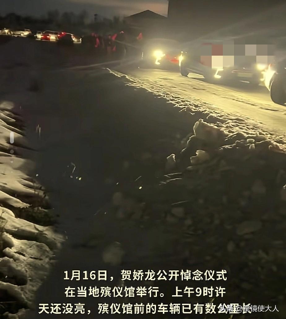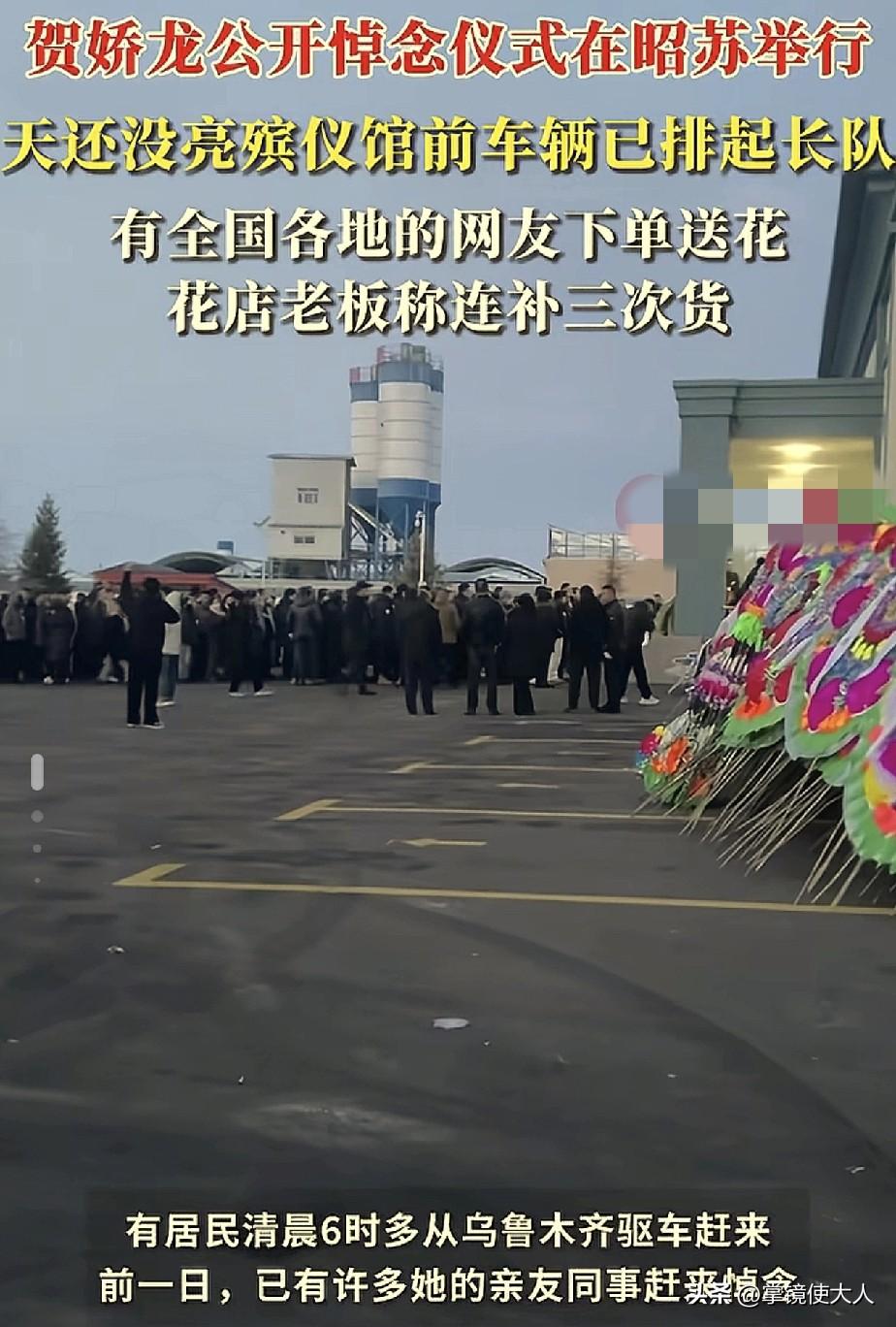 泪目了!贺娇龙悼念仪式,天还没亮,门口的车就排了好几公里,附近的花店补了3次货仍然不够卖,许多外地网友自发驾车赶往殡仪馆,送贺娇龙最后一程。 1月16日,贺娇龙悼念仪式在昭苏县举行,9点的时候天还没有亮,门口的车就已经排了很远,还有好多人半夜就从外地出发前来吊唁。 附近一个卖花的老板,补了3次货但是仍然不够,许多外地网友在网上下单,为贺娇龙送上一份心意。 贺娇龙将被安葬在父亲的公墓旁边,她的父亲是上个世纪60年代前往新疆的支边青年,父亲对贺娇龙的影响很大。 根正苗红,贺娇龙和她的父亲,把自己的一生都奉献给了新疆人民。 贺娇龙,一路走好!