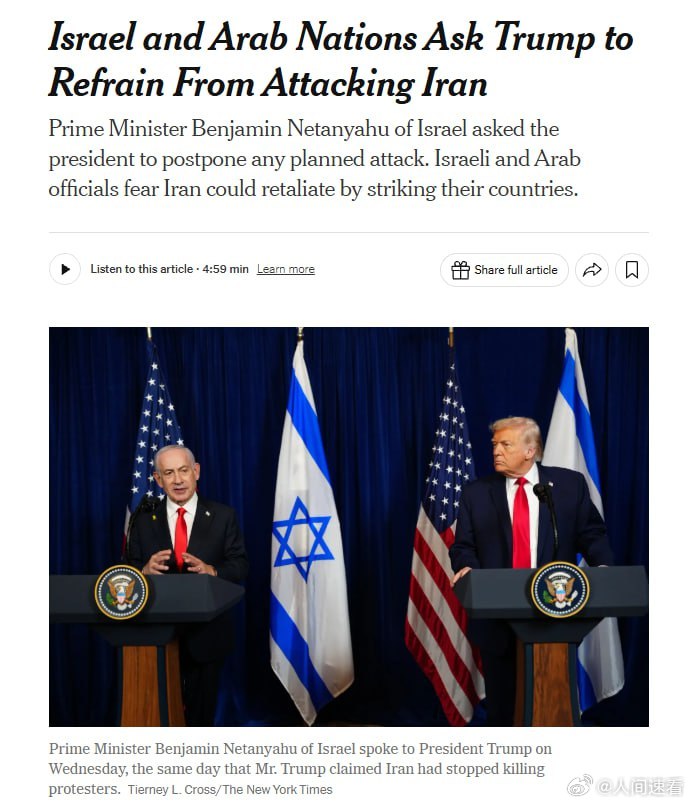 特朗普暂缓决定是否打击伊朗周三,以色列总理本雅明·内塔尼亚胡要求特朗普推迟对伊朗发动美国军事袭击的任何计划。以色列和阿拉伯官员都担心,伊朗可能会通过袭击他们的国家来进行报复。以色列总理内塔尼亚胡在电话中敦促特朗普推迟任何袭击行动,警告称伊朗政权不会迅速倒台,并提到对导弹防御准备工作的担忧。经过为期12天的战争后,以色列的导弹防御系统已严重疲惫,可能无法完全应对另一场重大冲突。鉴于内塔尼亚胡此前曾竭力说服特朗普对伊朗采取军事行动,这次警告显得尤为重要。省流:准备不足,妥当再打