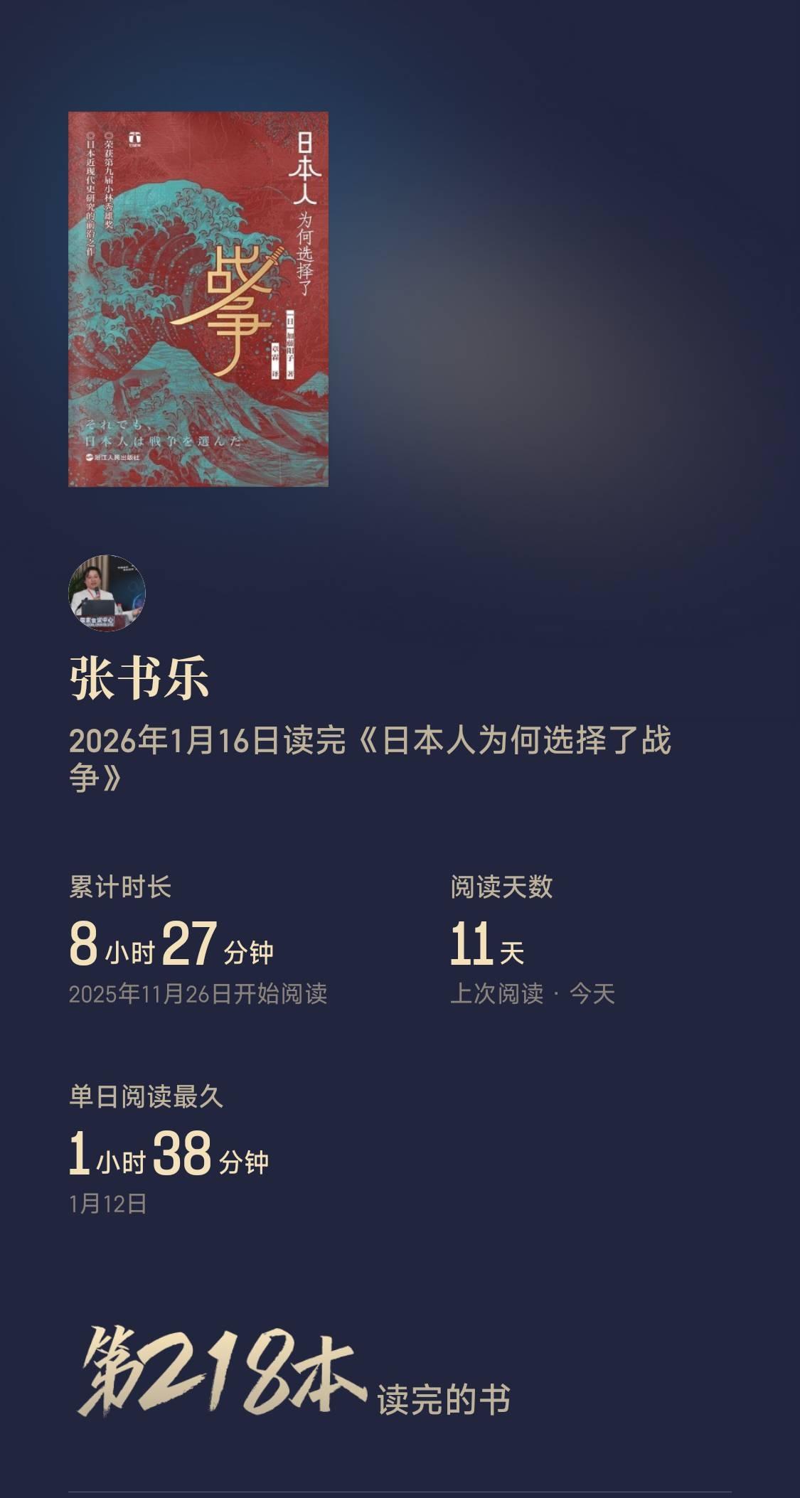今年读完的第一本书: 《日本人为何选择了战争》。 不同视角(日本学者)去回顾那段历史。 微信读书读完的第218本书。