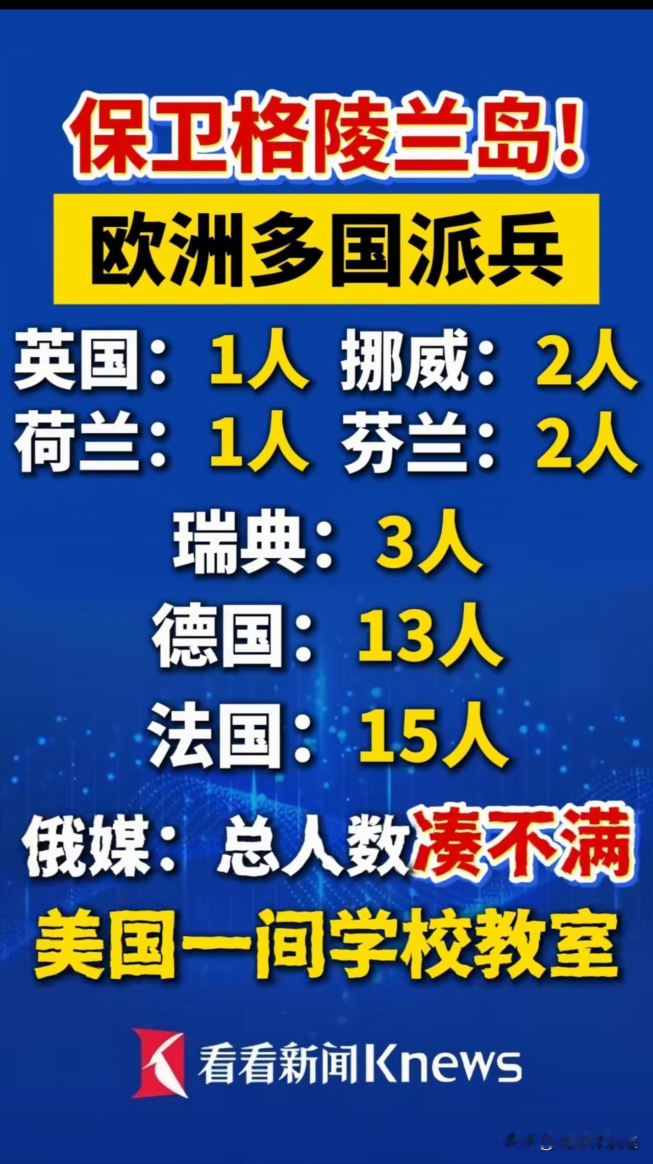 北约派出 37 人规模军队 前往北极 保护格陵兰岛!并抵制美军的侵略? 丹麦表示,将与北约盟国进行紧密合作,加强在格陵兰岛上的军事存在,目前有 7 个国家意愿派兵前往格陵兰岛。巴黎和柏林派出规模最大: 法国 15 人 德国 13 人 瑞典 3 人 英国 1 人 荷兰 1 人 挪 威 2 人 芬兰 2 人 从目前来看 37 人将在格陵兰岛进行必要的军事演习,交以此表盟北约对丹麦的军事支持! 美国看到北约“如此之规模”的军事力量抵达格陵兰岛,美国国务院发言论表示:不管北约什么规模抵达格陵兰岛,都不影响美国取得格陵兰岛的目标! 37 人的规模 美国真的不用担心,因为美国很清楚 北约不敢对美国有任何动作,美国想要格陵兰岛是势在必得。就算丹麦与格陵兰岛外长 前往美国白宫,美国鲁比奥及万斯也告诉他们 格陵兰岛美国必须取得,而丹麦是非法占领格陵兰岛! 就在法国 英国 瑞典都反对美国占领格陵兰岛,并派出如此“规模”这队前往格陵兰岛护岛 ,以此抵制美国入侵! 只能说离北约解散不远了吧! 从北约的反应来看,格陵兰岛归属美国 已经“毫无悬念”了!