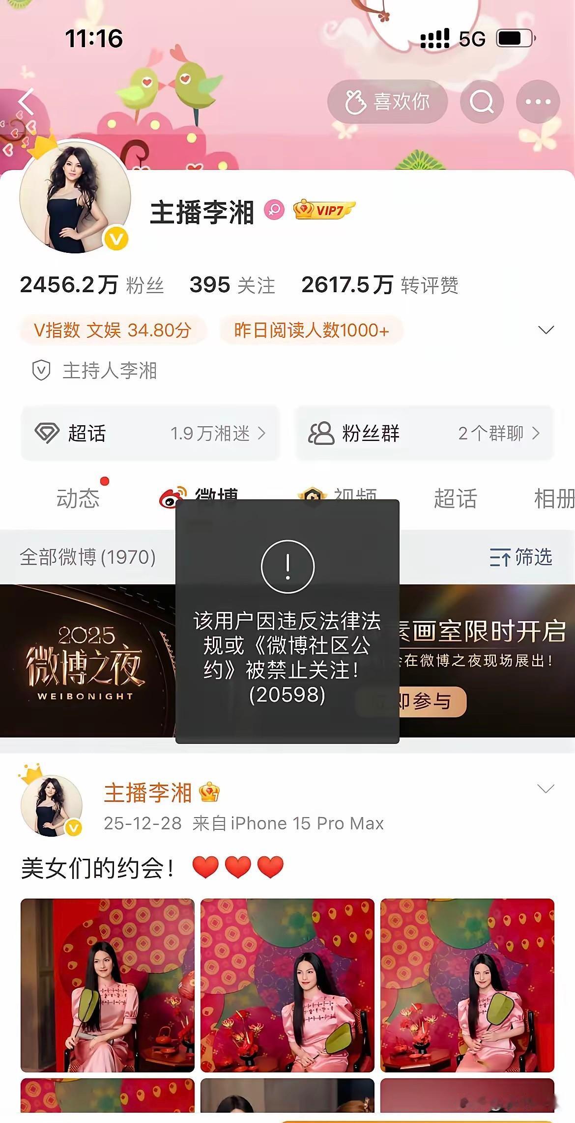 李湘究竟怎么了? 前几天王诗龄回英国,送机的只有王岳伦,如今再看,原来李湘的社交账号已被全平台“禁止关注”。 回顾李湘近期动态,一边是晒女儿与张艺兴跨年合照,一边是高达60万的“天价伙食费”争议。数据显示,其账号近30天掉粉超1.4万,显然大众早已对这种“凡尔赛”式炫富审美疲劳。 更关键的是,2025年底网信办刚发布新规,明确将“炫富拜金”列入负面清单。李湘的“富贵生活秀”撞上监管红线,结局不言自明。 除了内容违规,商业版图的收缩也耐人寻味。天眼查显示,李湘关联企业20家,其中14家已注销,包括多家影视文化公司。这种“大撤退”式操作,难免让人联想是否存在税务或经营合规问题。毕竟,在娱乐圈税务风暴未歇的当下,任何资本异动都逃不过监管的法眼。 曾几何时,李湘是湖南卫视的当家花旦,后来转型360娱乐总裁,又投身直播带货,广告报价高达30万/条。 但当“富养”变成“炫富”,当“成功”异化为“拜金”,流量反噬只是时间问题。 当“共同富裕”成为时代强音,那种脱离群众的“奢华叙事”,注定会被时代抛弃。互联网的记忆虽长,但容错率,越来越低了。 李湘