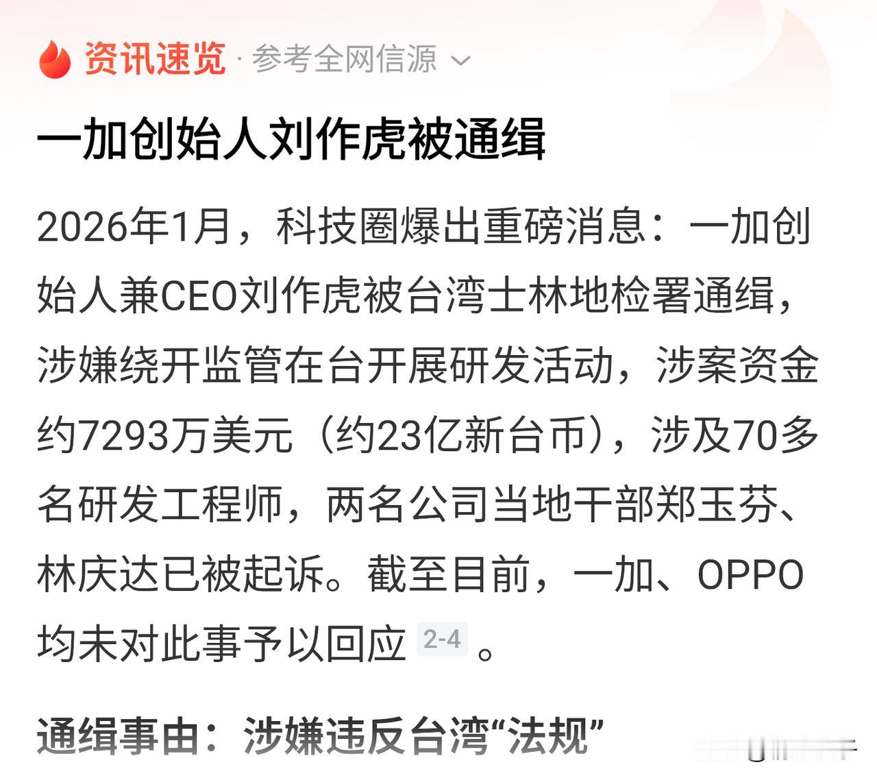 什么?湾省居然要通缉,一加手机的创始人刘作虎[笑哭]? 这湾湾又给大家整活了[捂脸]!26年1月13日,台检方对一加刘作虎发出通缉。说自2014年开始,一加在台招了70多位工程师,汇了23亿新台币发工资[机智]。 此外台湾检方,还起诉郑玉芬和林庆达两人,这两位是台籍负责人,罪名是"违反两岸人民关系条例"[偷笑]。 咱们大陆公司,给台湾的工程师发高薪,竟然被台湾方面说是"犯法"[叹气]?台当局这样做,纯粹就是作秀吧? 我看他们目的,不是真要抓刘作虎。而是用台籍负责人"杀鸡儆猴",警告他人别和大陆企业合作[思考]。 湾湾这种闭关锁岛的操作,让台湾本地人才能不跑吗?你对这事咋看的?来评论区说下你的看法吧[灵光一闪]。