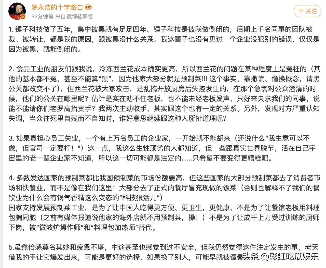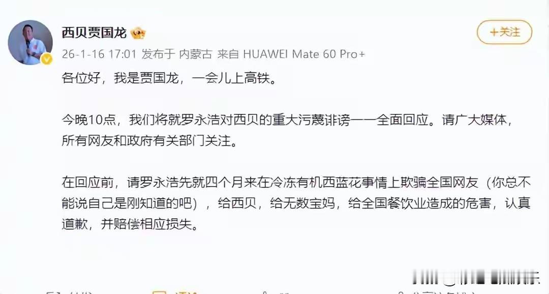 贾国龙是全网第一个自己把自己锤死的人,他最新发声要罗永浩道歉,罗永浩也回应了,自己企业倒闭不要甩锅给别人。 我没想到贾国龙至今不明白自己到底错哪儿了,他有严重的认知缺陷,他打着健康旗号把预制菜卖高价,这就是企业失败的原因。 罗永浩只是实话实说,其实当时贾国龙道歉认错请罗永浩当首席体验馆。自己下定决心整改,拿出诚意来,而不是死鸭子嘴硬一直解释拒不认错,一步步把西贝作死了,最该向西贝道歉的人是他!