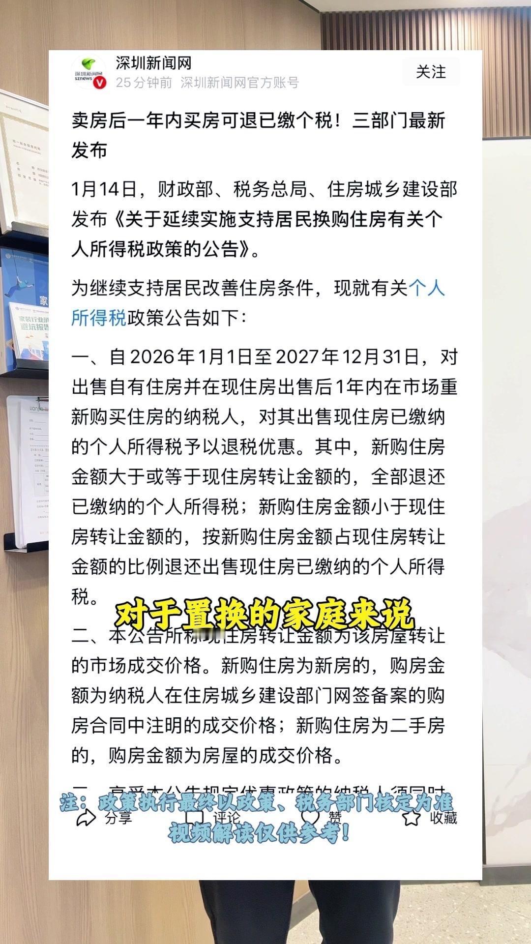 🏠置换家庭速看!购房退个税政策又有新消息啦!刚刚看到政策发布,对于置换家庭来说真的是好消息,我来给大家详细讲清楚。 首先,必须是先卖掉房子再买,买在前边卖在后边是不行的。其次,退个税是按照卖价和买价中较低的那个来算,比如卖100万买150万,就退100万相应的个税。 重点是政策现在延长到2027年年底,从今年1月1日到明年年底。有人担心之前没提交个税票是不是就错过机会了,其实不是的。只要你在2025年年底前拿到个税票,一年以内买了房,用这个票去提交,税务部门随时都能受理,看的是票日期不是提交日期。 退到的个税款大概一个月左右能到账,快的十来天就能拿到,我自己就经手过好几起这样的案子。