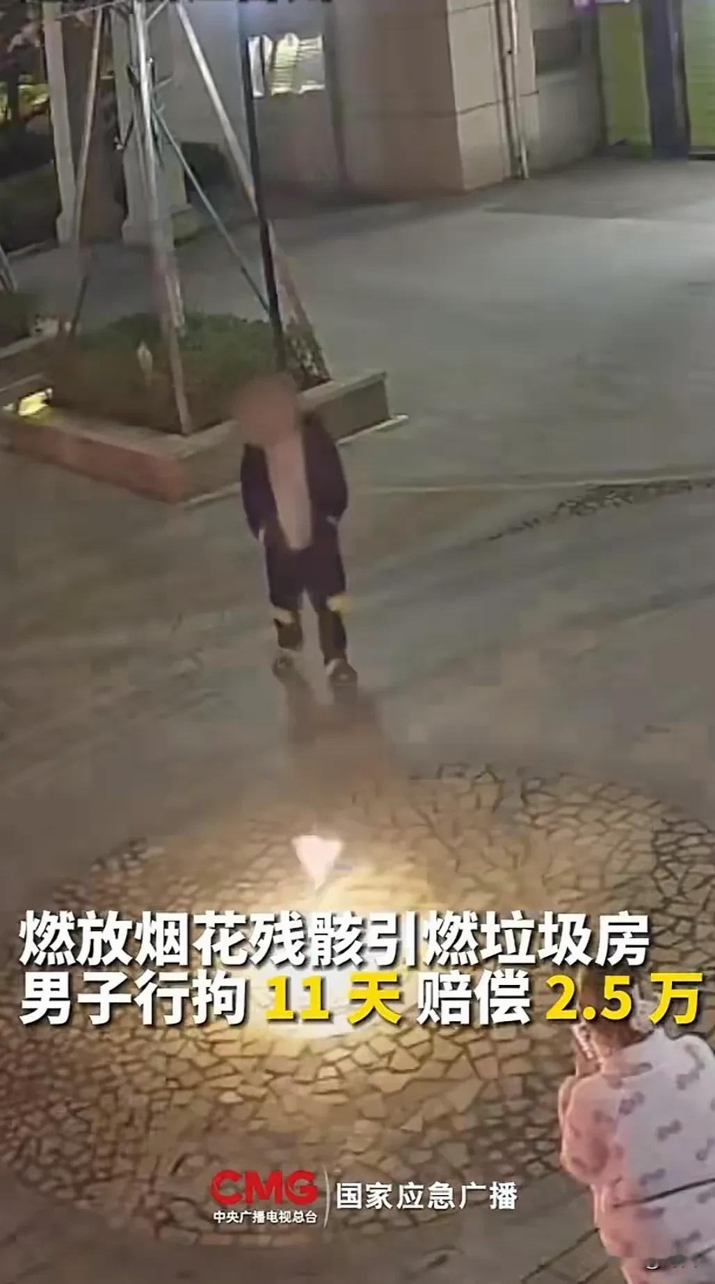 元旦夜放烟花后好心办坏事,引起火灾赔偿25000元拘留11天。事发1月1日元旦时间0点左右,在浙江省台州市某街道,一名男子带着女友庆祝新年,点燃了购买的烟花,一分钟后男子以为烟花已熄灭,于是将其拿到垃圾房中扔掉。 谁知烟花内部并没有熄灭,5分钟后,烟花引燃了垃圾房燃起大火,有居民看到后立刻报警,消防员随后赶到将大火扑灭。警方也接着侦查起火原因,发现是该男子所为,随后传唤其到派出所处理。最终因违规燃放烟花爆竹罚款300元拘留11日,引起火灾损失赔偿25000元。 男子元旦夜燃放烟花最终赔偿25000元