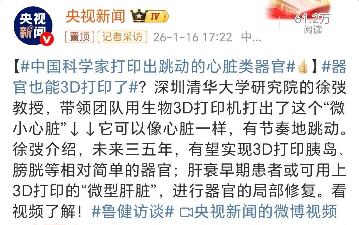 器官也能3D打印了 救命!居然可以用生物3D打印机,打出了会自主跳动的“微小心脏”,还可以避免排异,三五年内胰岛、膀胱这些简单器官有望落地,这以前只在科幻片里见过啊,以后都不用等捐献了!那得拯救多少家庭啊!