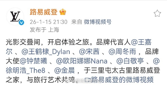 LV官博官方顺位:王嘉尔、王鹤棣、周冬雨、宋茜、钟楚曦、欧阳娜娜、白敬亭、金晨