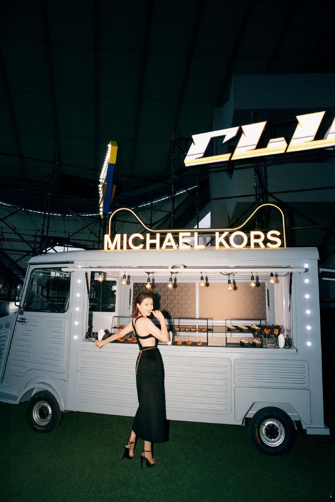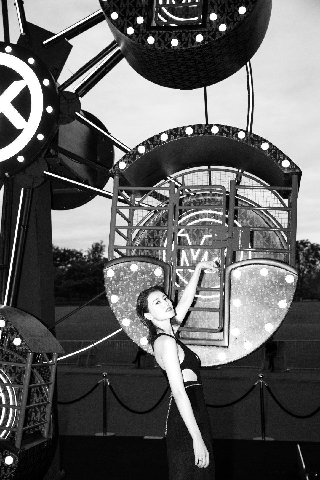 高圆圆 利落短发搭配满印针织裙,简约剪裁勾勒出纤细身姿,同系列手袋呼应整体造型。