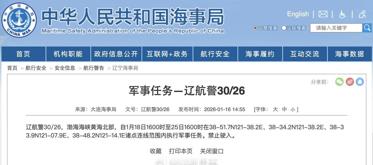 【航行警告!渤海海峡黄海北部执行军事任务】据中国海事局网站消息,大连海事局发布航行警告,1月18日16时至25日16时,渤海海峡黄海北部部分海域执行军事任务,禁止驶入