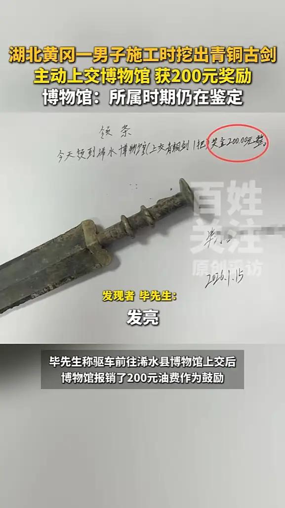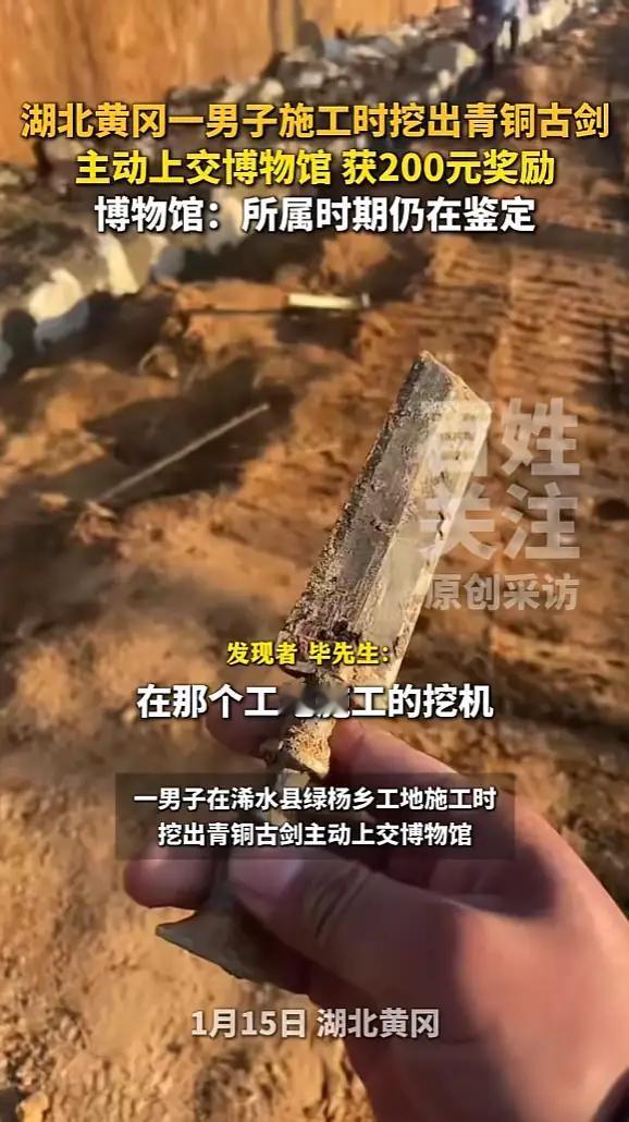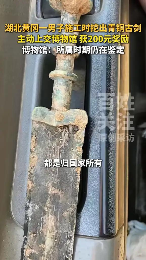 湖北浠水工地惊现千年战国青铜剑!上交国家获200元奖励引全网激辩:是鼓励还是寒心