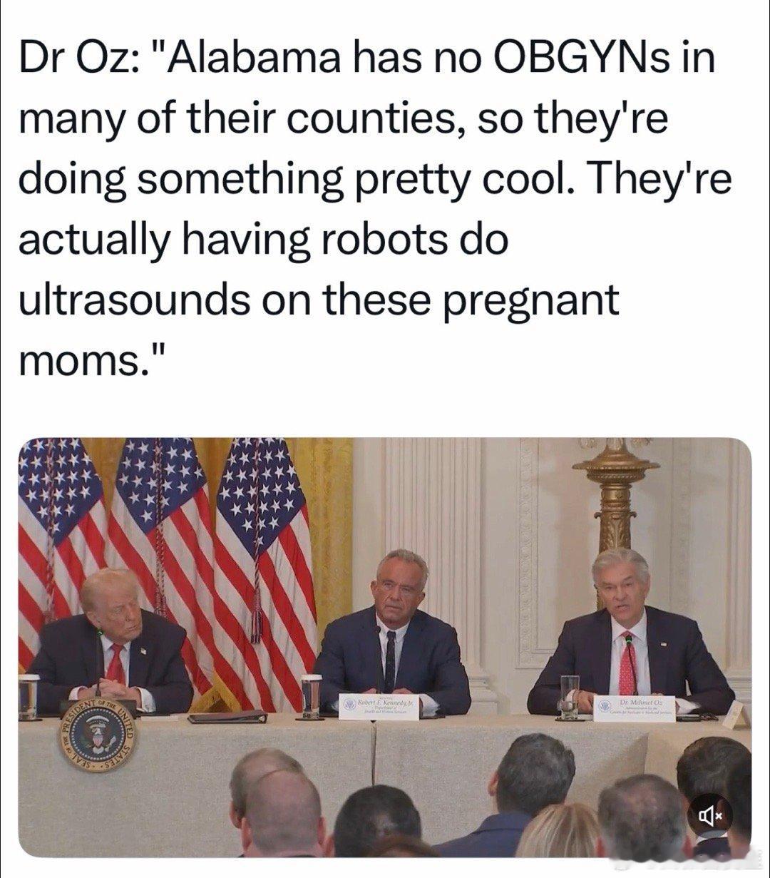 卫生部在白宫举行的活动上,联邦医保负责人介绍说:阿拉巴马州很多地方,没有妇产科医生,所以机器人给孕妇做超声波检查,很酷🤖(注:阿拉巴马州缺妇产科医生,因为“保守派”政客通过了严格的反堕胎法,即使为挽救孕妇生命、实施堕胎的医生也会被判刑)