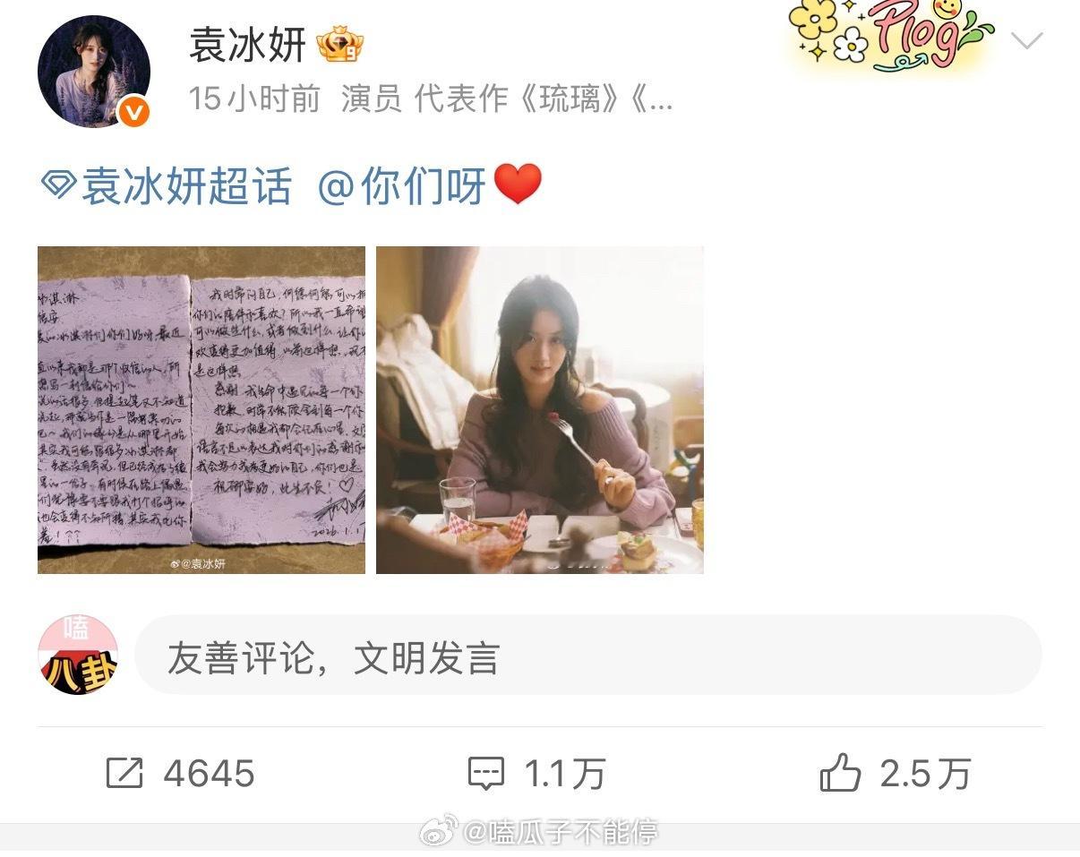 袁冰妍发微博给粉丝写了手写信,看zzp的互动数还不少这是要复出了吧
