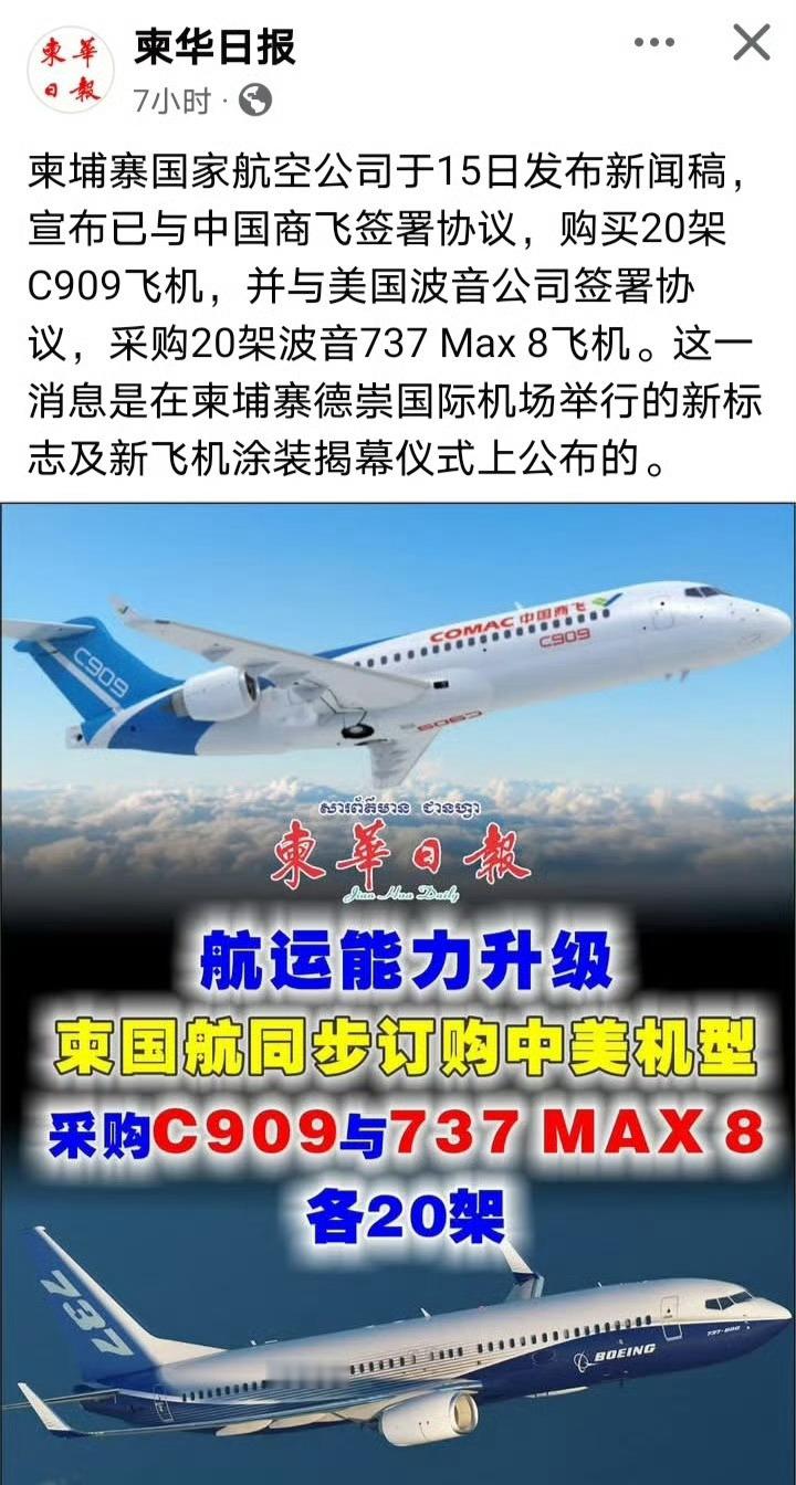 柬埔寨媒体:柬埔寨国家航空公司15日宣布,已签署协议将从中国商飞购买20架C909飞机,并从美国购买20架波音737Max8飞机。 热点观点