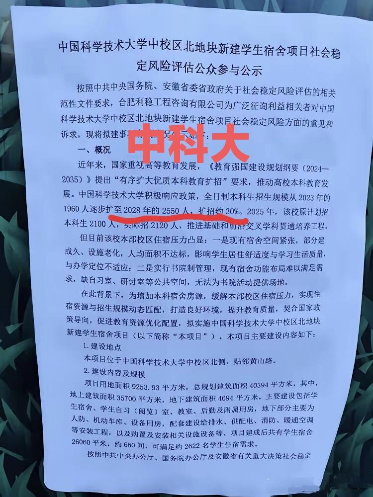 好消息,中科大全日制本科生招生规模2028年将扩至2550人。要知道,从2023年本科招生只有1960人,五年扩招约30%,2025年实际招生也超过原计划20人,一共招了2120人。也就是说,未来三年,还要扩招430人。 中科大目前存在问题是校本部校区住宿压力突出,宿舍紧张、设施老化、人均面积不达标,且宿舍功能布局无法满足书院制管理的公共空间需求。因此,中科大在想办法新建宿舍增加本科生房源供给,缓解本部住宿压力,匹配招生规模,优化教育资源配置。 新建宿舍选址中科大中校区北侧(贴黄山路),用地9253.93平方米,总建筑面积40394平方米;建成后有660间宿舍,可满足约2622名学生住宿需求,都是四人间。 中科大还应该在北京多招生几个学生,北京头部考生素质非常优秀。