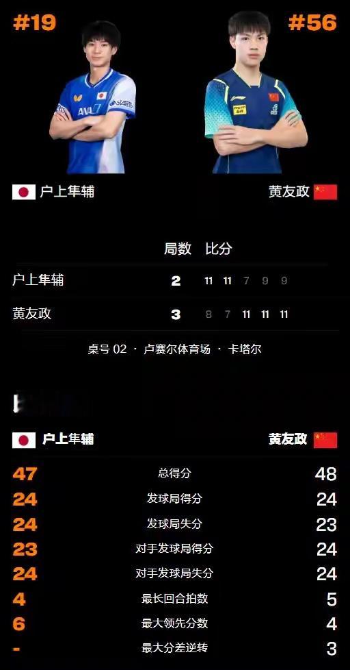国乒小将惊天逆转!0-2连扳3局胜日本世界冠军,中国队6人晋级男单16强2026年1月17日凌晨,国乒结束WTT多哈球星赛男单第二轮的所有较量,其中20岁全国冠军小将黄友政在首轮0-2落后3-2大逆转后再次发威,同样在0-2落后的情况下3-2翻盘淘汰日本全国冠军、世界冠军户上隼辅,最终国乒拿到了6个男单16强的席位——黄友政VS户上隼辅战况与其他国乒男单次轮战况请看下文。【比赛看点】2005年出生的黄友政与2002年出生的户上隼辅分别是中国和日本的全国乒乓球锦标赛男单冠军,此外户上隼辅还是世乒赛的男双金牌得主,双方都具备不俗的实力,技术各有千秋,不过年龄相对更大的户上隼辅相对更有经验一些。本站比赛黄友政在男单首轮差点崩盘,在对阵葡萄牙的阿波罗尼亚时0-2落后3-2逆转,随后晋级迎战实力更强的户上隼辅,压力非常大,结果他又复刻了同样的壮举。【比赛过程】比赛开始后,户上隼辅在首局就打出了自己的超强搏杀能力,扎根近中台猛攻黄友政并取得优势,随即以11-8拔得头筹,紧接着第二局依样画葫芦,以非常强势的抢攻屡屡破防,这次以更快的速度11-7拿下,由此而大比分2-0领先将国乒小将逼入绝境。第三局背水一战的黄友政再次落后比分,但他稳住阵脚以过硬的发球与抢攻实力找到了突破口,同样以11-7扳回一城,随后第四局状态回升并领先比分,后半段虽然再次战平但最终遏制住了户上隼辅的抢攻,最终以11-9险胜,决胜局大战由此而到来。第五局户上隼辅开局不利先丢3分,但黄友政很快便被对方的进攻打乱阵脚,随即以3-5落后于人,紧接着后半段也基本在落后追赶,不过最终在9-9的位置战平对手,紧接着连续进攻逼户上隼辅回球失误,最终以11-9锁定胜利,由此而再次成功逆袭淘汰对手晋级。【比赛数据】【国乒男单次轮战报】目前国乒男单次轮有3人在外战中晋级、1人因对手不战而胜过关、2人淘汰队友,另有1人输丹麦选手,详情如下:外战:林诗栋3-1朴康贤(韩国)、黄友政3-2户上隼辅(日本)、向鹏3-2希德仁科(个人中立)、温瑞博3-0林昀儒(中国台北,退赛),陈俊菘2-3林德(丹麦);内战:周启豪3-2梁靖崑、薛飞3-2陈垣宇。那么接下来谁能继续晋级拿到8强赛的门票呢,悬念仍然存在。来源 全言乒乓 如有侵权联系删除