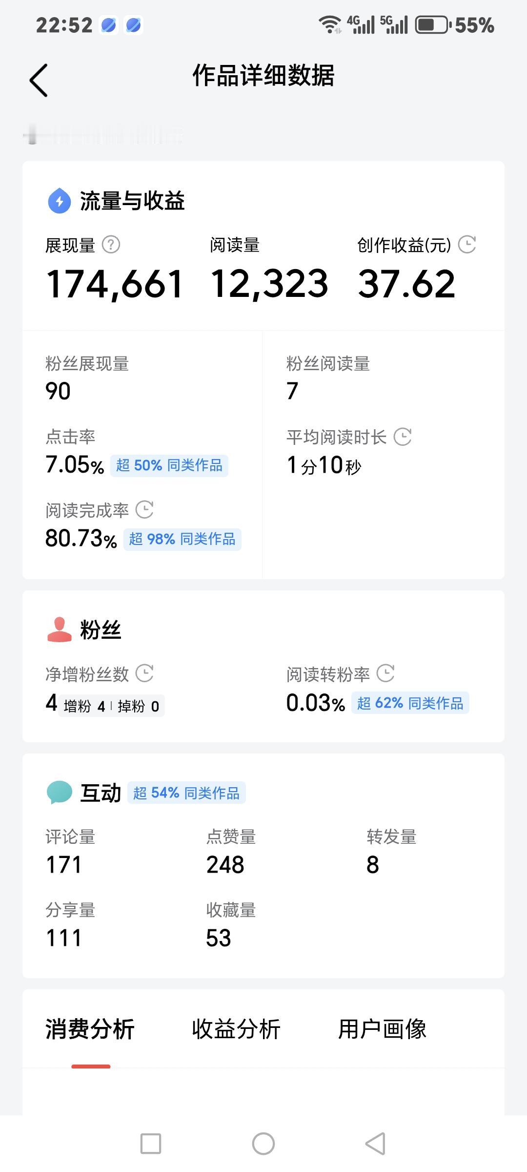 近来发什么作品无论是展现量还是阅读量,均为下降趋势,平台对作品越来越挑剔,过去还有十万加五十万加,现在十万都被视为中上了。阅读量更是惨不忍睹,四位数的阅读量都难达到,三位数的阅读量是为常态。平台对于那些口水文撇于一边,转为向深度文发掘作品,一小时展现量不过四位数的,基本都没什么希望了,收益更是一路向下,一天换个泡泡糖都换不回。不知各位展现量和阅读量势头强劲不强劲,千次阅读单价有无提升?