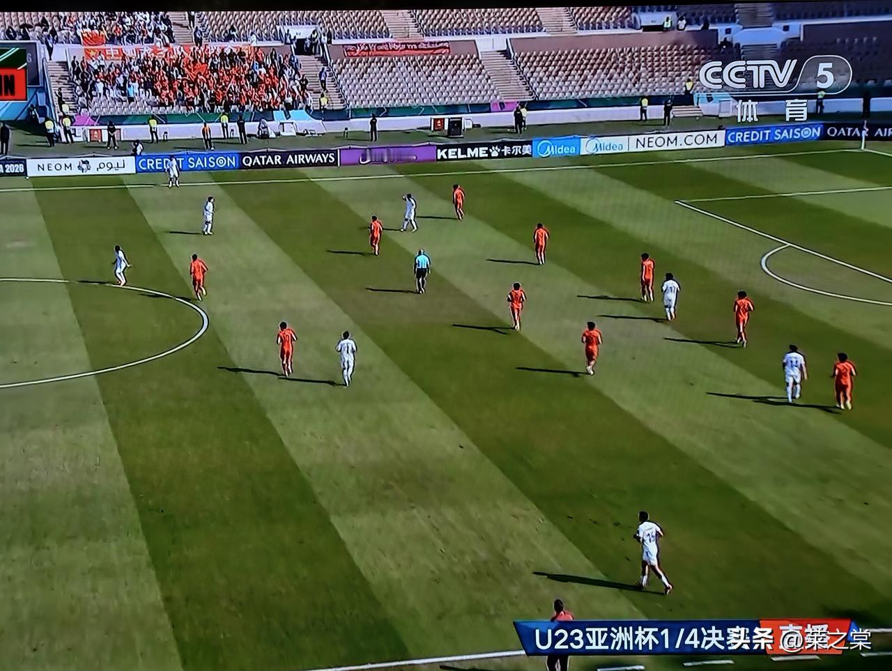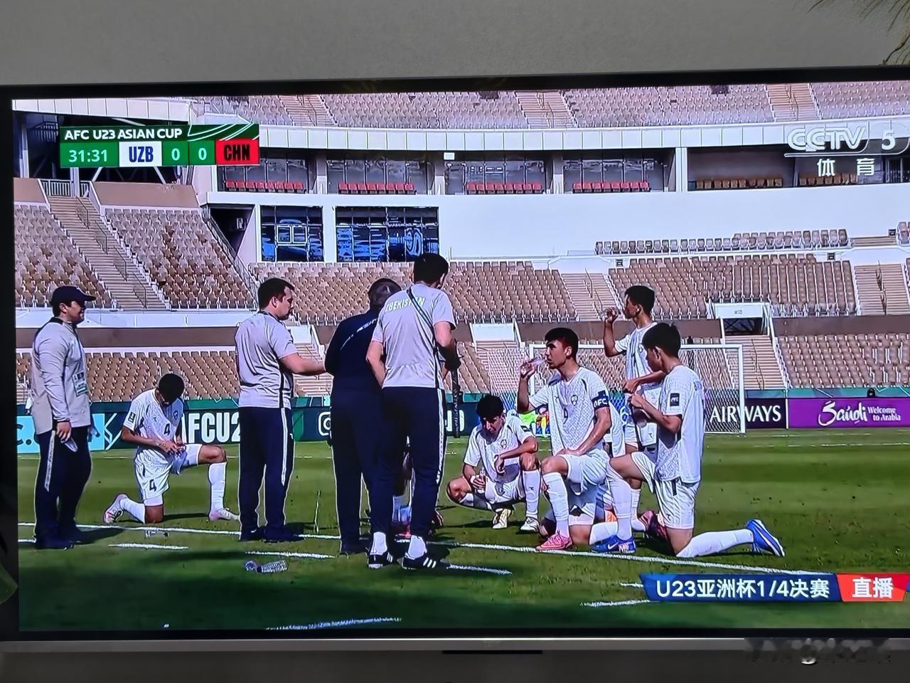 上半场进入补水时间,场上比分0:0。感觉这场比赛,中国队的小伙子们很累啊。基本上成为乌兹别克斯坦队的半场攻防演练,守门员李昊的发挥一如既往神勇。 30分钟后,中国队开始有控球了,这是好现象。希望反击能够犀利一些,打出威胁。