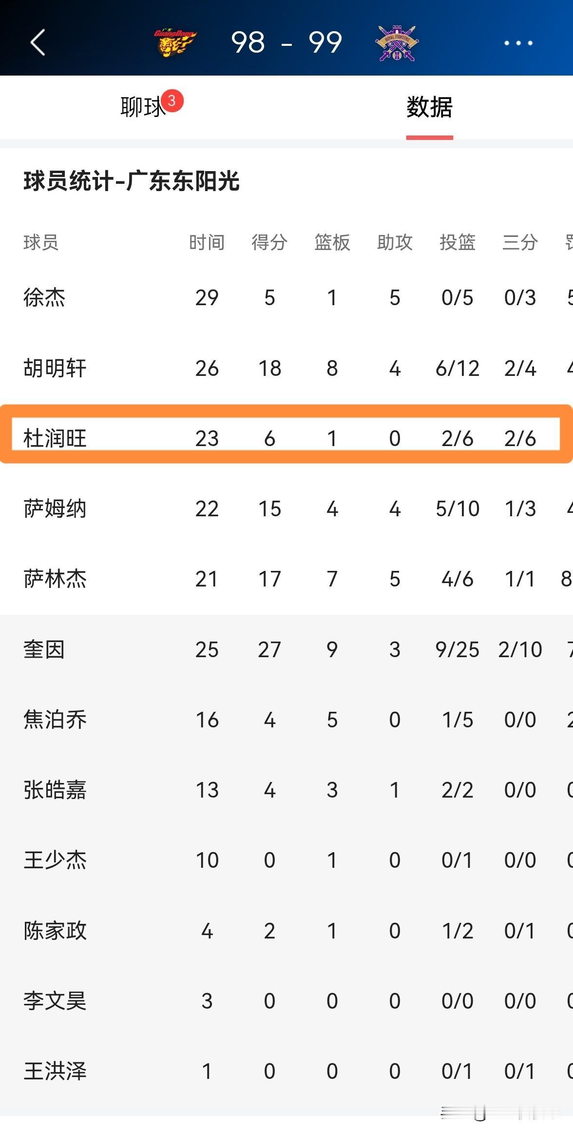 广东东阳光神射手杜润旺真是浪得虚名!在今天广东东阳光主场以98:99输给北京控股的比赛中,杜润旺首发出战23分钟,三分球6中2非常低效的得到6分,还有2次犯规,他的场上正负值为-5。 实事求是的说,作为广东东阳光在三分线外的主要火力点,本场比赛杜润旺的表现是无法让人满意的,杜润旺必须在接下来的比赛中提高自己的三分球命中率才行。
