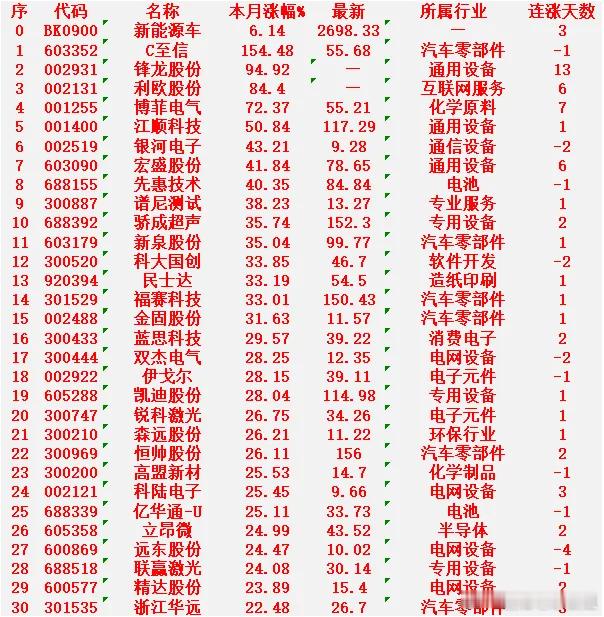 新能源车概念,一月以来涨幅最多的30名单汇总一览C至信:+154.48%,最新价