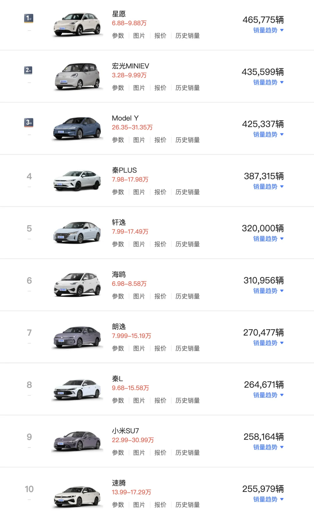 2025年,中国新能源乘用车渗透率达57%,首次反超传统燃油车,标志着中国汽车产业正式迈入新能源汽车主导时代。满谈汽车据乘联分会数据显示,2025年全国乘用车市场累计零售销量为2374.4万辆,同比增长3.8%。其中,新能源乘用车市场零售为1280.9万辆,同比增长17.6%,占比57%;传统燃油车国内零售1093.5万辆,同比下滑9%,占比43%。2025年中国汽车市场最显著的变化是本土品牌的全面崛起,在国内单一车型榜单前十中,只有日产轩逸、大众朗逸/速腾三款燃油车进入前十,其它均为中国品牌。年销超40万辆的车型有三款,分别为吉利星愿、五菱宏光MINIEV和特斯拉Model Y;年销超过30万辆的有六款,包括比亚迪秦PLUS 、日产轩逸、比亚迪海鸥。