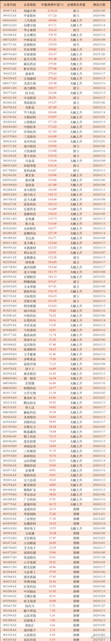 年报预告密集落地!63家公司业绩预增超100%随着月末临近,A股年报业绩预告进入密集披露期,业绩表现呈现分化态势,既有多家公司大幅预增,也有部分企业面临业绩承压。截至1月17日,沪深两市已有139家公司披露年报业绩预增公告,剔除ST股及未上市新股后,预增企业数量仍超130家。在预增阵营中,高增长企业表现亮眼,不少公司预计全年业绩增幅达50%乃至100%以上;其中业绩预增中值超100%的公司达63家,占当前预增总数近五成。从行业分布来看,此次年报预增的公司中科技赛道占比显著,AI算力、芯片、创新药及新材料等领域相关企业扎堆现身预增名单。