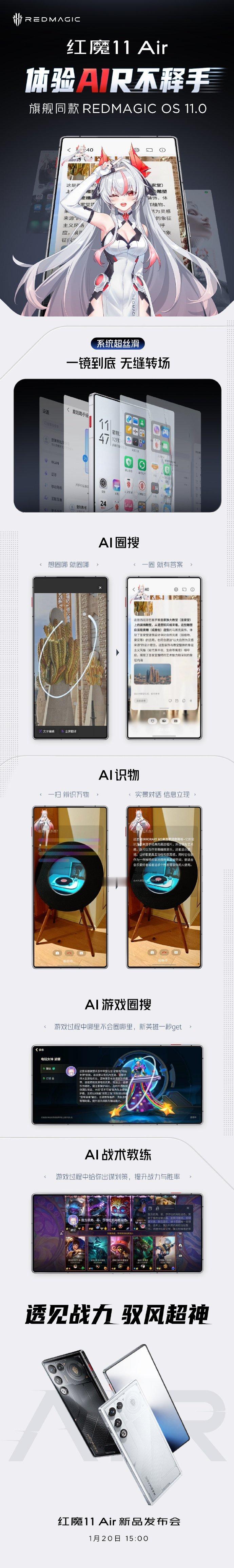 【红魔 11 Air 手机搭载旗舰同款系统 REDMAGIC OS 11.0,拥有多种 AI 功能】红魔官方在微博宣布旗下 11 Air 手机将搭载旗舰同款系统 REDMAGIC OS 11.0,号称“体验 AIR 不释手”,1 月 20 日下午 15:00 正式发布。据介绍,这款手机将拥有 AI 圈搜、AI 识物功能,支持图片找物、全屏翻译、实景对话等,还带有 AI 游戏圈搜,可在游戏过程中“哪里不会圈哪里”,AI 战术教练还能够在游戏过程中给用户出谋划策,提升战斗力、胜率。结合IT之家此前报道,红魔 11 Air 手机将搭载高通骁龙 8 Elite(骁龙 8 至尊版)处理器、自研电竞芯片红芯 R4,匹配 LPDDR5X ULTRA 内存及 UFS4.1 存储,独家内置 PC 模拟器,号称“无体验门槛、无复杂操作、多平台兼容、支持离线畅玩”,适配《古墓丽影 9》《刺客信条:叛变》《极品飞车 17》等游戏。在此之前,红魔 11 Air 手机已官宣将搭载 6.85 英寸 AMOLED 悟空屏,宣称真无孔,拥有 95.1% 屏占比 + 1.25mm 极窄边框,支持 144Hz 高刷、2592Hz 高频 PWM 调光和 DC 调光,号称“电竞屏的最优解”。