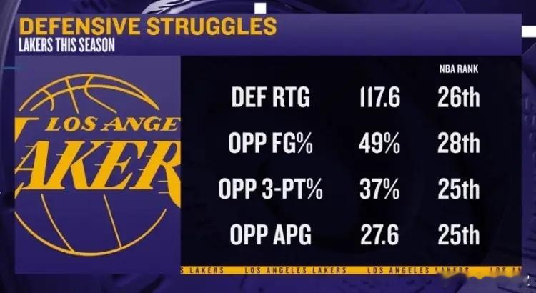 好烂!湖人本赛季防守数据:防守效率:117.6 ——联盟第26位对手投篮命中率:49%—— 联盟第28位对手三分命中率:37% ——联盟第25位对手场均助攻数:27.6 ——联盟第25位什么叫糟糕的防守,呐,这次你就见到了,洛杉矶湖人就是经典案例。