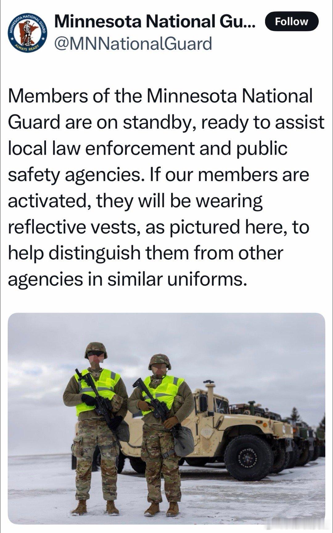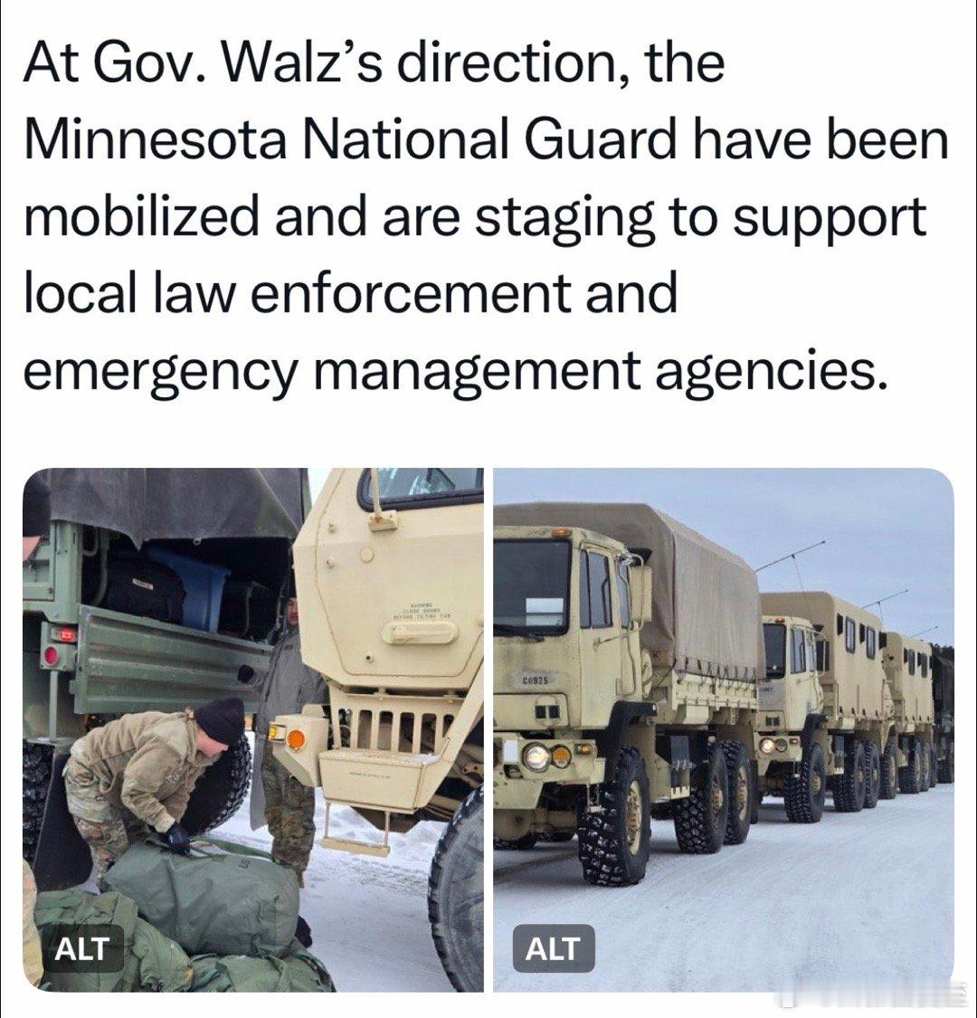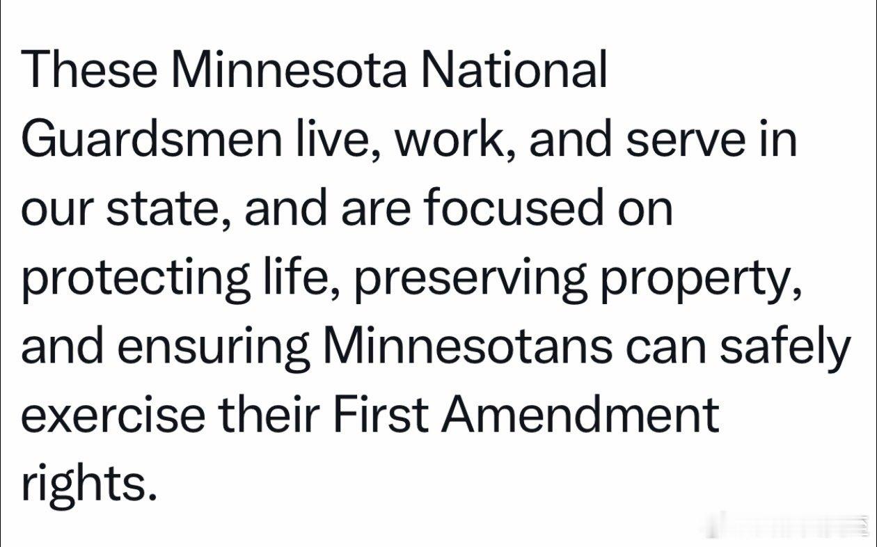 明尼苏达州长,开始调动本州国民卫队,“保护人民群众生命财产安全” 明州National Guard,专门强调如何将这些“子弟兵”与“其他穿制服的”区分开来