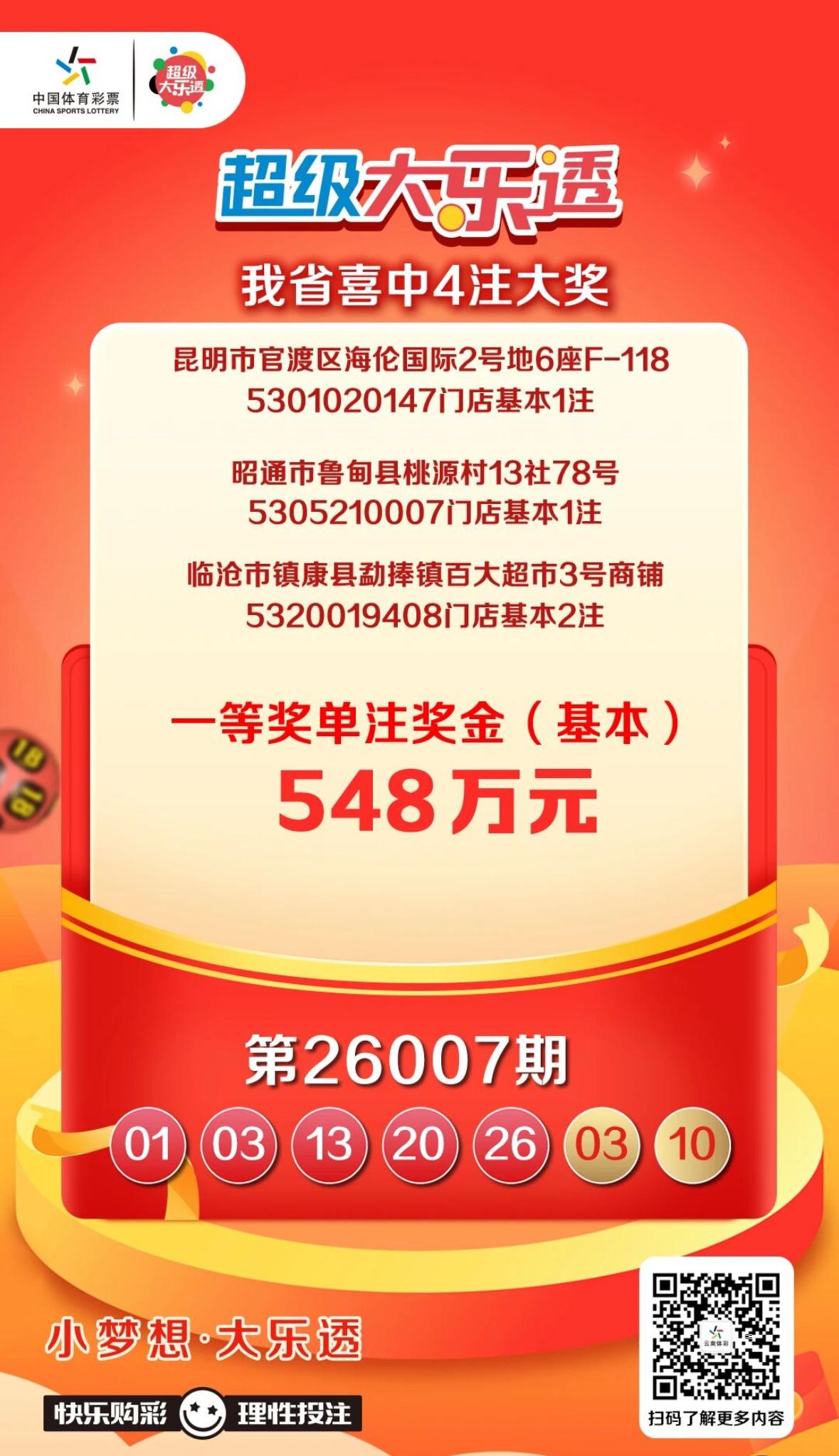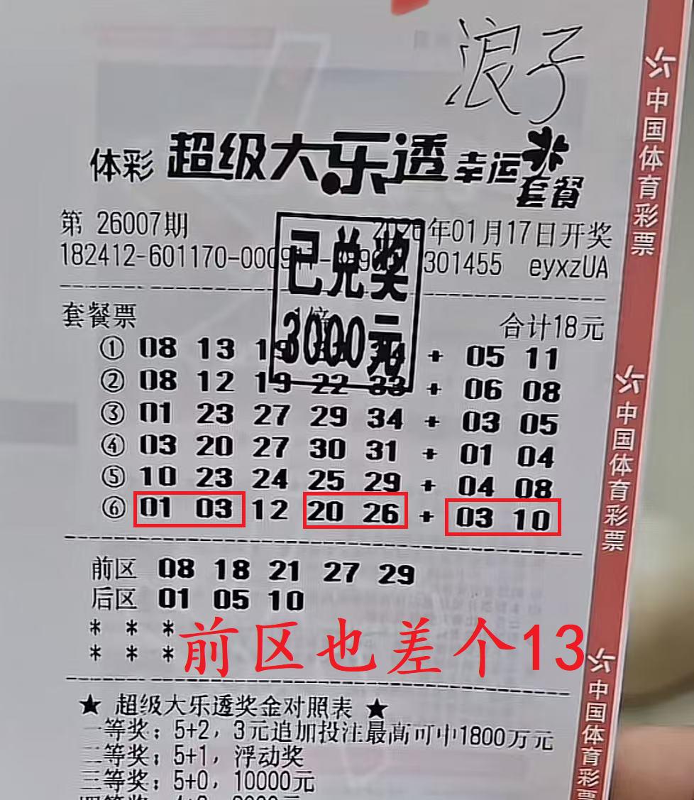 大乐透第26007期开奖结果于昨晚揭晓。令人惋惜的是,不少彩友仅因前区13一号之差,与一等奖擦肩而过。说来也巧,13这个位置明明符合斜连走势,本不该成为“拦路虎”——就连我自己预测的1+2也精准命中了它。[呲牙][呲牙][呲牙] 先看云南曲靖这位彩友,一注自选单式票,独独在前区漏了13;再看河南鹤壁的一张18元复式套票,这是个赠票,虽是机选,却也偏偏倒在同一数字上。 机选之失或许尚可释怀,可云南那位彩友是亲手自选,恐怕至今仍在反复懊恼吧,一念之差,不仅改变个人运气,更让云南错过昨晚一举揽获5注一等奖的机遇。
