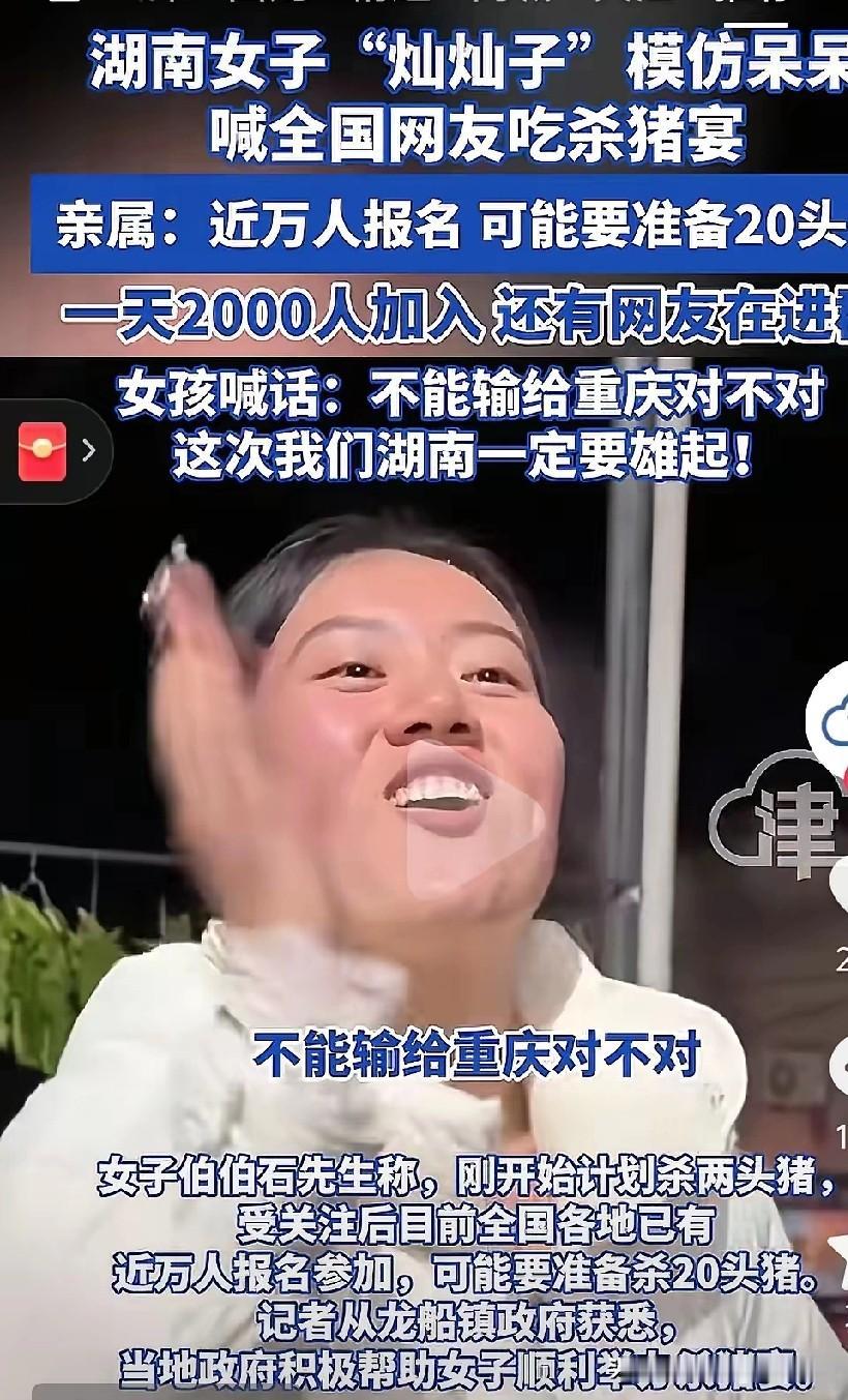 心疼灿灿,这个杀猪饭办的七零八落的,一开始说18号杀19头猪,后来说办不了了,结果湖南常德妮姐,跨省连夜赶来撑场,又开始宣传18号团圆家宴又支棱起来了,照常进行 。 听到灿灿说照常举办,很多粉丝都闹腾了,一些已经奔波在路上了本想,这次灿灿杀猪宴如期进行,一定会超过合川的呆呆,毕竟有大网红撑着场面,常德妮姐可是2000万的大网红,有她在这杀猪宴应该是空前绝后的壮观,怕会摆个几百桌。 他们也是为了安全起见,计划把杀猪宴变成流水席,灿灿说18号早上10点半第一席开吃,每隔两小时吃一席,12点吃第二席,下午2点吃第三席,因为在农村场地有限,加上考虑到很多安全问题,打算分成三次吃完,下午2点吃完就结束了,让大家早点回去。 安排的挺妥当的,猪也到位了,妮姐也到位了,正在期待着他们的杀猪宴,结果18题凌晨4点多,妮姐团队和灿灿围在灿灿家的柴火旁边,很抱歉地和粉丝们宣布,杀猪宴办不了了,上面的人不给办,有很多不可抗拒的因素。 灿灿的笑容不再那么灿烂了,一开始她说要办杀猪宴时,两眼放光,讲得天花乱坠,眉飞色舞的,人逢喜事精神爽嘛!看得出来她信心满满,对自己即将要办的杀猪宴是相当激动。 她模仿合川的呆呆,发了一个抖音,说自己家的老父亲也老了,按不动猪脚,需要几个人来帮忙按住什么的,反正作业抄的一模一样,也没有任何创新,只是猪比呆呆家杀的多,要杀10多头,建的500人的群也比呆呆多,报名人数也是空前绝后的,成千上万了。 但是,不知道何故,灿灿被举报了,网友们说什么公开要嘉年华什么的,感觉还是灿灿满脸都写满了对嘉年华的渴望,最后灿灿的号被封了,她相当郁闷,好不容易吆喝来的几万粉,说封就封。接着她很遗憾地宣布杀猪饭取消了,还不断给网友们道歉,之前心态阳光灿烂的灿灿哭了。 本想不办就不办了,才道完歉没有两天,常德妮姐跨省连夜赶来撑场,又开始宣传18号团圆家宴又支棱起来了,照常进行,灿灿又开始有了点笑容,但是半夜被叫停,妮姐都说实在没办法,那边那个屋子里面来了好几波人,杀猪宴办不了了,此时的灿灿一句话都不想说了,心情再次跌入谷底。 1月18日,相关抖音视频进一步透露,“所有的东西都准备好了,不准办”,取消原因是“遇到不可抗拒因素”;另有视频称“不是因为办不起,是上面的上面要取消”,而且场地被封了三天。 只能说,强扭的瓜,不甜。人家呆呆是临时起意,无心插柳柳成荫 ,加上天时地利人和都占了,父母同意让网友们来吃泡猪汤饭,政府支持呆呆家杀猪,文旅局赞助人力物力,村民淳朴协助,网友们提着东西双向奔赴,多方合力才有了呆呆泼天的流量。而灿灿是有意为之,一上来就说不能输给呆呆,目的性太强,不是这里出问题,就是那里不同意,阻力太多总会半路翻车。
