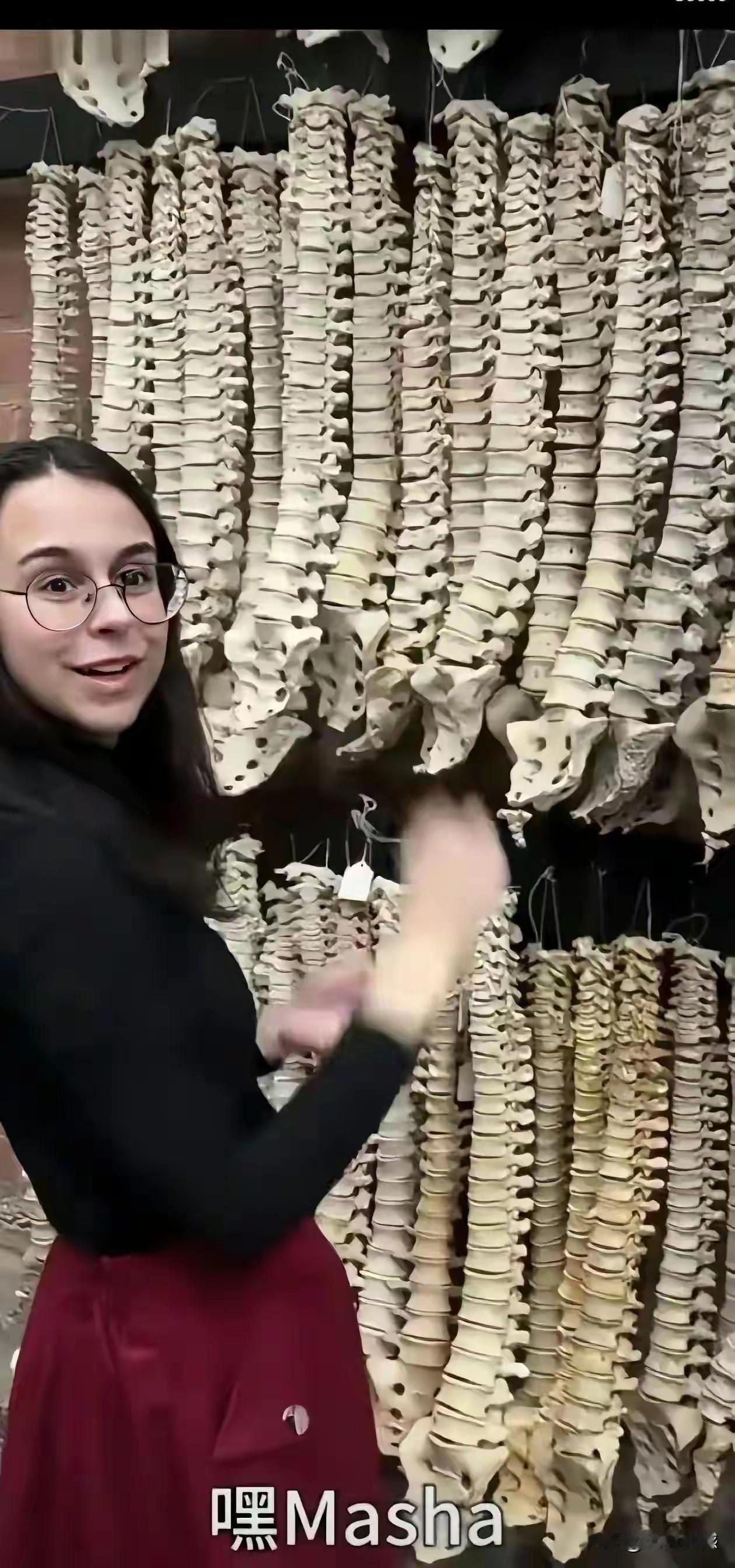这些骨骼是做什么用的?看着白花花的一片,让人觉得有些后背发凉,这应该是脊柱骨,不知道这个女子收藏这些东西做什么,莫非这是学校的教学工具,女子是这方面的老师或是或是管理这些骨骼的人,也可能是医生,总而言之,这个女子的胆子很大,非常佩服她的胆量!