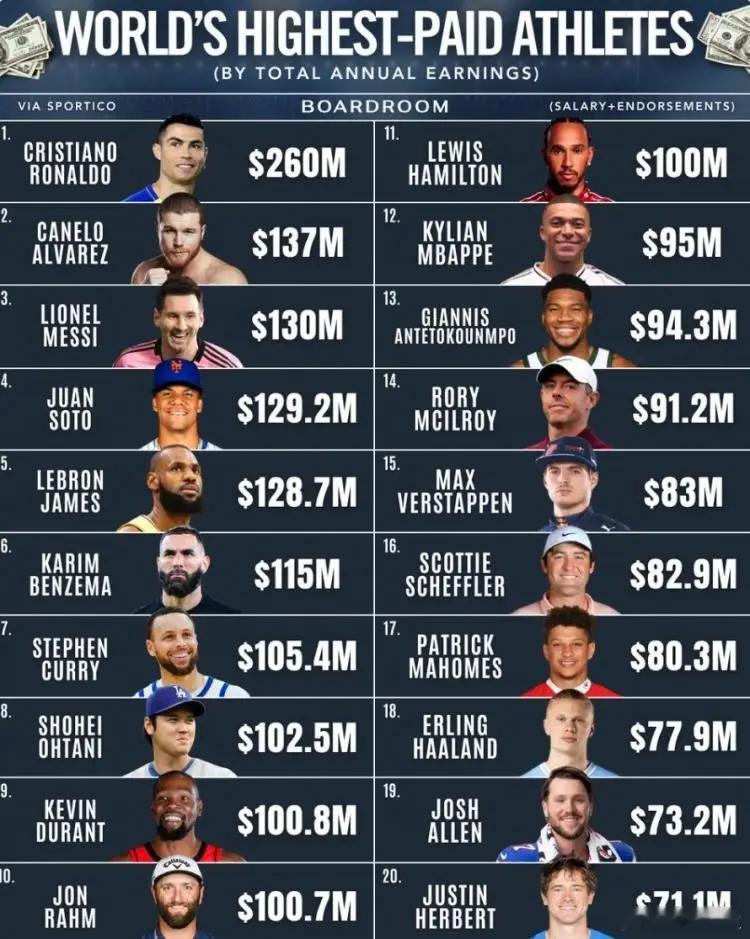 2025年度运动员收入榜:詹姆斯1.287亿美元第五