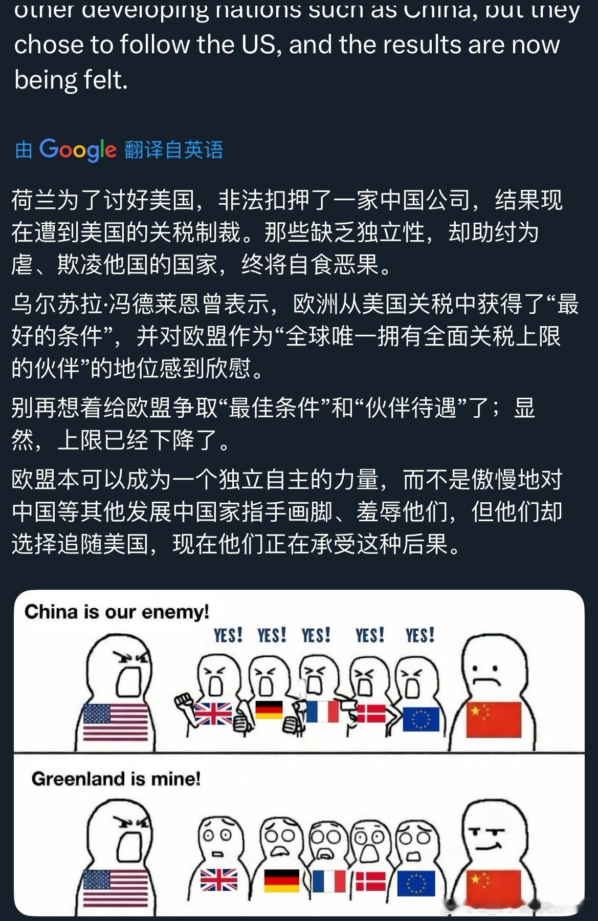特朗普因格陵兰岛向欧洲8国加税不少欧洲国家,尤其是小国,自以为在欧盟的大旗下就能逆国际局势与实力对比而为,动辄对发展中国家口诛笔伐、充当“教师爷”,在国际关系中搞冷战思维、选边站队,那么在乱世之中就注定会付出代价。北欧五国中,我对挪威与芬兰比较熟悉。多年前我还曾前往奥卢和赫尔辛基,参观过诺基亚实验室和芬兰造船厂。彼时的芬兰虽已初显颓势,但国家总体上仍务实踏实,政治上也延续着历史上“芬兰化”的传统,不过多介入复杂的国际纷争。“芬兰化”通常指一个弱小国家为保全自身,在军事、外交等核心事务上迁就强大邻国的政策。这个词源于冷战时期芬兰对苏联的政策实践。当时的芬兰坚持军事中立,不加入北约,也不参与任何针对苏联的军事同盟;在外交上高度自律,于国际事务中主动考虑苏联立场,避免公开批评;经济上则加强与苏联的经贸往来,未曾参与美国主导的“马歇尔计划”。许多芬兰人并不喜欢“芬兰化”这一称谓,视其为小国在强权压力下为求生存而被迫做出的屈辱性让步,认为该词过度简化甚至冒犯了芬兰那段艰难历史中所展现的灵活、务实的外交智慧。因此,“芬兰化”的传统在冷战后逐渐淡化,尤其是在桑娜·马琳上台后,芬兰的政治倾向性愈发明显,中立态度发生极大转变。到了如今的斯图布时期,芬兰外交部长出访时参与他国反对派游行、公开干涉内政;斯图布本人在内政经济上的政绩乏善可陈,反倒是在各种国际事务上冒进发声。与之相伴的是,芬兰的经济状况与社会环境已发生巨变,显得愈发孱弱且保守。此次在芬兰转机,感受与多年前相比已大不相同。小国在夹缝中求生存本就不易,当美国彻底抛弃国际秩序、开始霸凌盟友时,其处境便更加艰难。中国的公正、平和以及对小国的尊重,或许让某些国家产生了“可以随意欺侮他国”的错觉,借着欧盟的大旗狐假虎威,更让它们逐渐迷失了自我。冒然出头的芬兰如此,违法没收中国公司的荷兰等国如今也都开始面临国内发展的严峻问题。经济规律和实力对比不会迁就意识形态。经济差就是差,实力弱就是弱,关键时刻便会原形毕露。欧洲,可谓将一手好牌打得稀烂。欧洲与美国,正从两个方向向世界展示:西式民主在当今时代,是如何与现实脱节、与现状格格不入的。 芬兰总统回应美加征关税