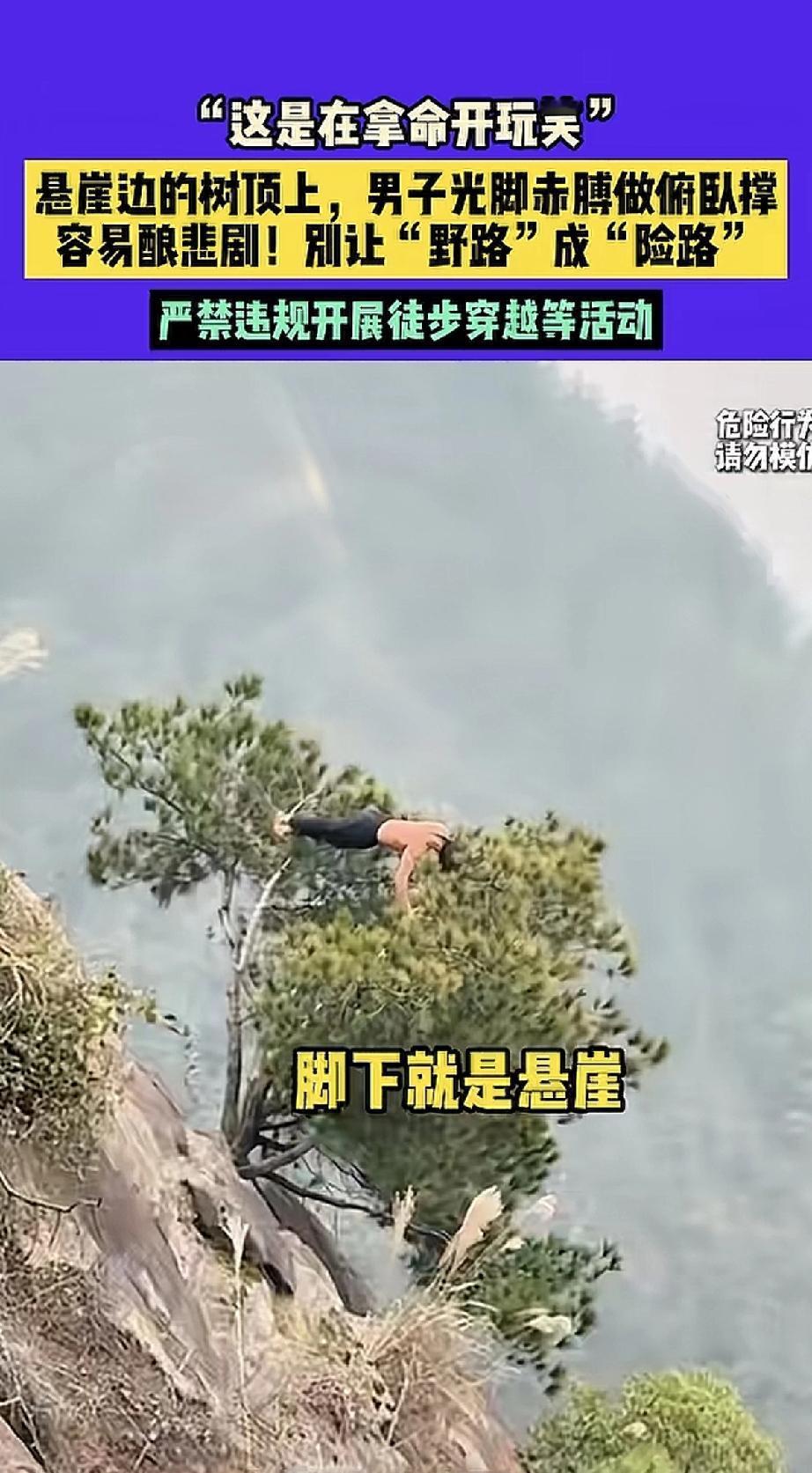 我的天,看着都腿软!悬崖边上一棵斜着长的树,一个男的居然光着膀子、打着赤脚,在树顶上做起了俯卧撑! 脚下就是万丈深渊,稍微晃一下,后果都不敢想。这哪是锻炼?简直是在拿命开玩笑! 现在有些人为博眼球,专挑这种“野路子”玩惊险。可生命不是儿戏,一次失手,就可能酿成无法挽回的悲剧。千万别为了那点流量或刺激去模仿,安全第一,别让“野路”真的成了“不归路”!